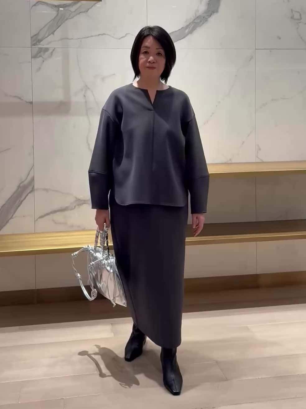 ジャージトップスとIラインスカートのセットアップで、すっきり縦長ラインを意識したスタイルに。トップスはラウンドヘムでボトムを選ばず、スカートは縦の切り替えでスタイルアップ効果も◎。単品使いでも活躍する汎用性の高いセットです。