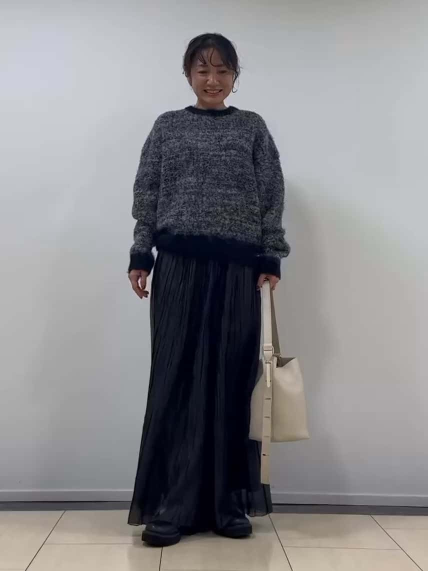 ナチュラルな起毛感が魅力のアルパカ混ニットは、独特のぬめり感と自然な光沢で暖かく上品な印象に。衿ぐりと袖口の無地切り替えでさりげなくアクセントを効かせています。合わせたランダムプリーツのオーガンジーパンツは、縦長ラインでスカート見えするデザイン。ブラックで統一して大人っぽくまとめたスタイルです。