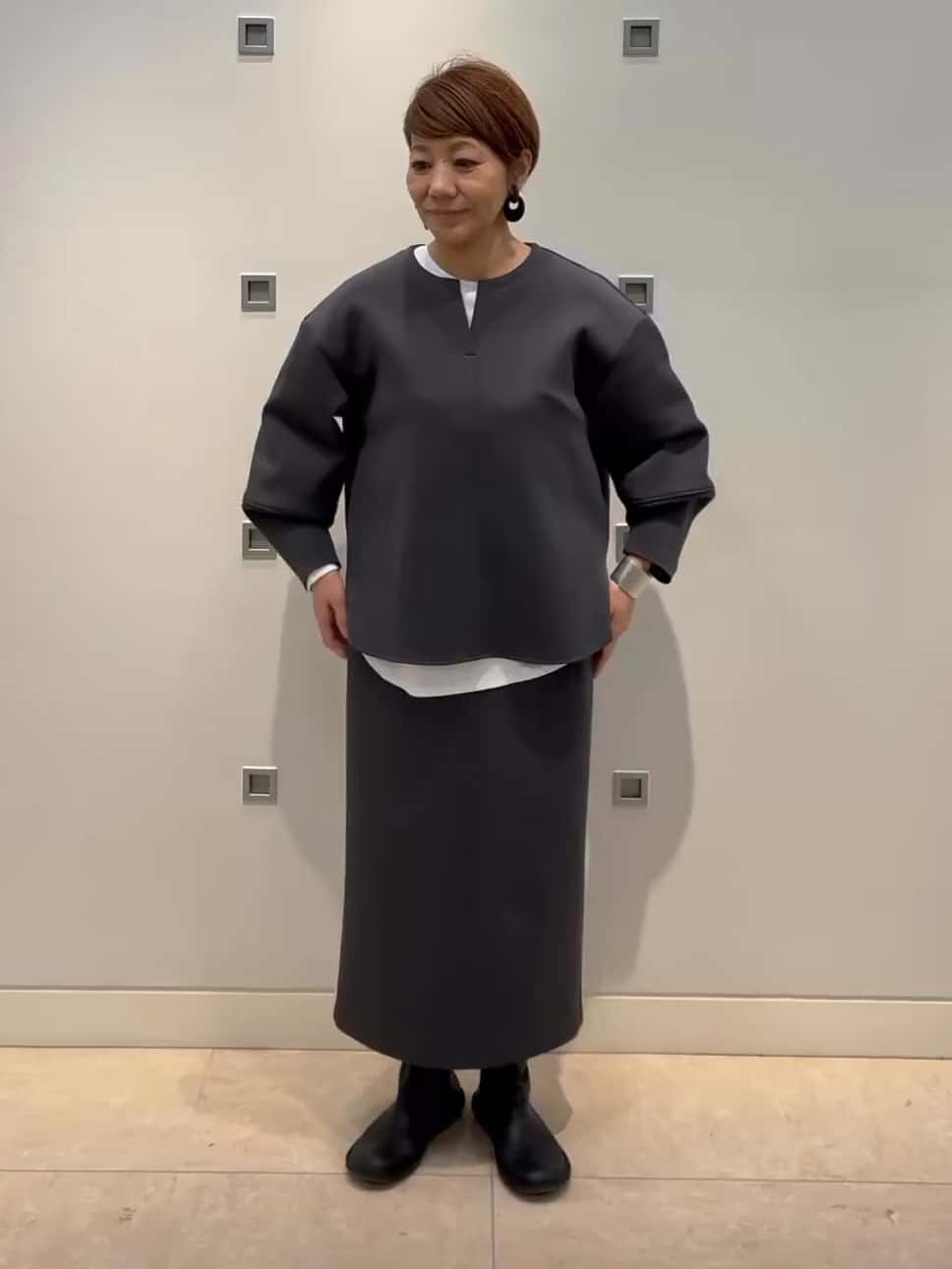 スッキリ見えるスカートとのセットアップで女性らしい印象に。