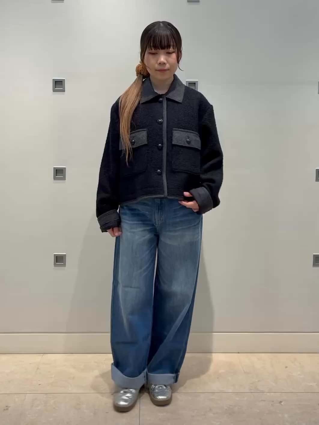 品のあるツイードジャケットに太めのデニムを合わせてキレイめカジュアルなコーディネート。ジャケットの丈が短めなので長さのあるパンツと合わせる事でスタイルアップ!61EFJ120 2/② ブラック53FFP580 1/① ブルー