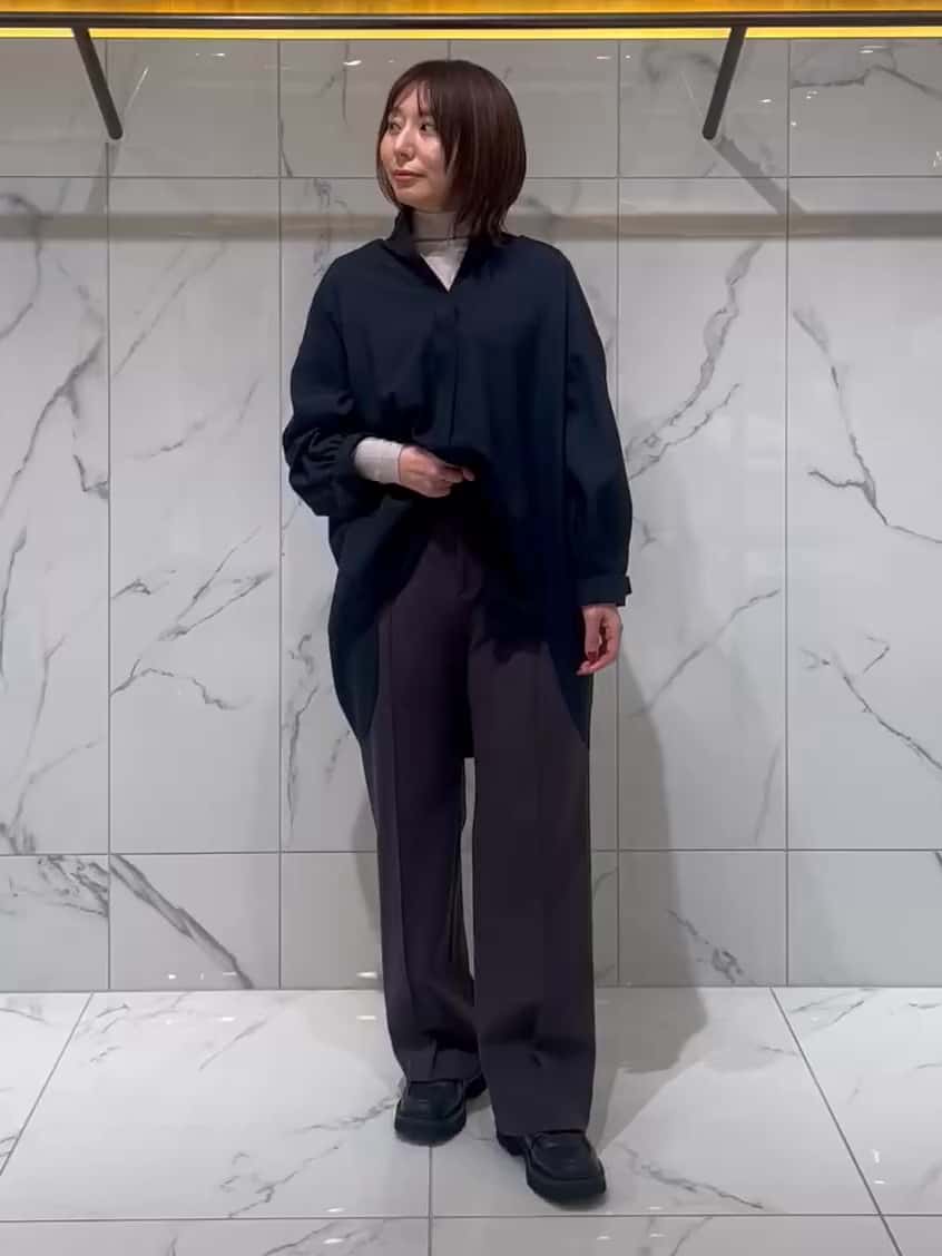 ネイビーのブラウスは、軽くて落ち感のきれいな素材。肩の力が抜けた形で、羽織りにもなる便利な1枚です。