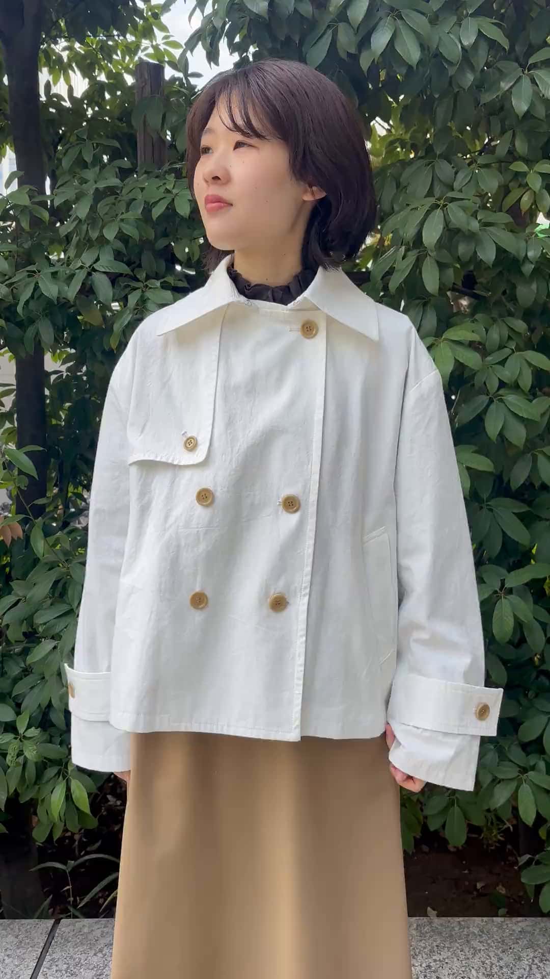 春先の羽織りにおすすめなショートトレンチジャケット。爽やかなオフカラーが新鮮です♡オンオフ問わずに着られるジャンスカをinしてきれいめカジュアルコーデの完成です!