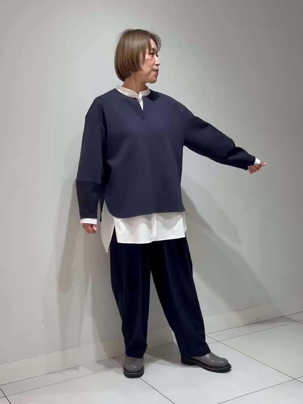 インナーには軽い素材のバンドカラーブラウスを重ねています。抜け感のある肩ラインで、上から羽織ってもバランス良くまとまる便利なアイテムです。