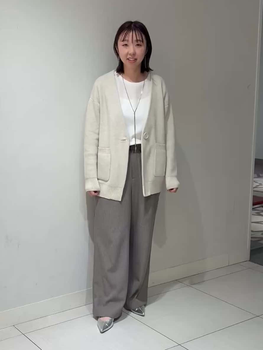 パンツはやわらかい印象のストライプで、太めの形でもすっきり見えるデザインです。