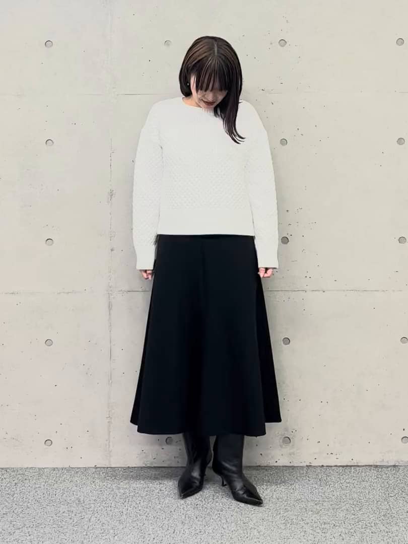 スカートはトリアセテート混のジャージ素材で、落ち感と上品な光沢がきれいです。ウエストはゴム仕様で楽に穿け、オフのニットを合わせると大人のモノトーンスタイルにまとまります。