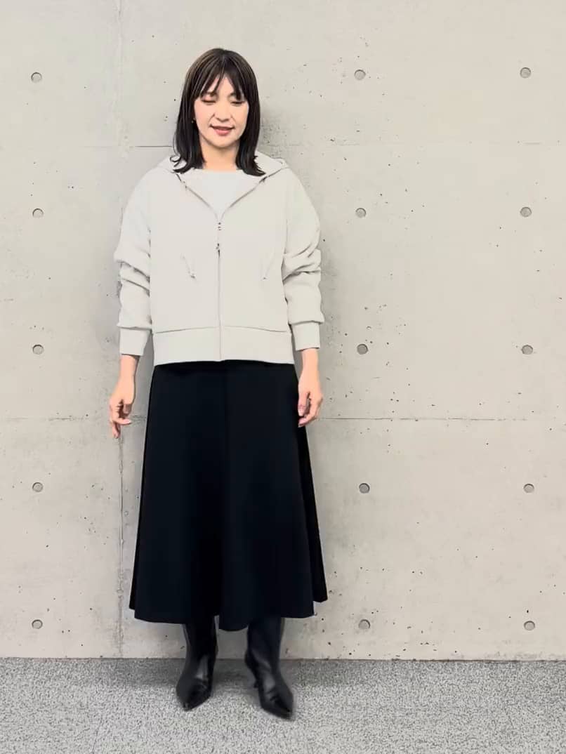中にはワッフル編みのコンパクトニットを合わせ、表情をプラスしました。スカートはトリアセテート混のジャージ素材で、落ち感と上品な光沢があり、ウエストゴムで楽に着用できます。全体を淡色×ブラックでまとめると、程よく大人なカジュアルスタイルに仕上がります。