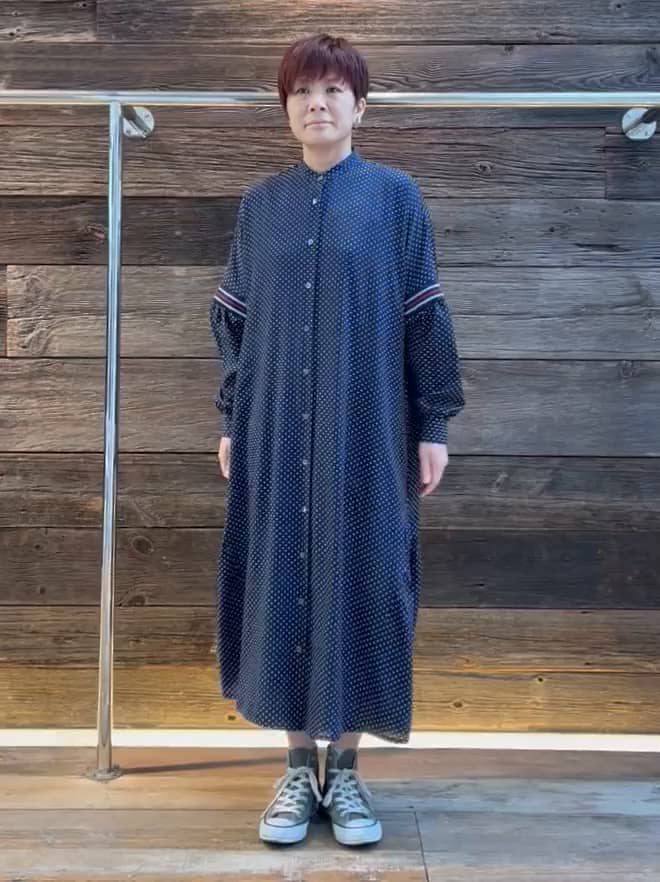 【スプラッシュドット ワンピース】着用サイズ/カラー : 0サイズ(S)/ネイビーサイズ感 : ゆったり着用感 : サラッとした光沢感のある生地で、裾のふんわりとしたシルエットが可愛いです。袖と後のスポーティーなラインリブが良いアクセントになっています。