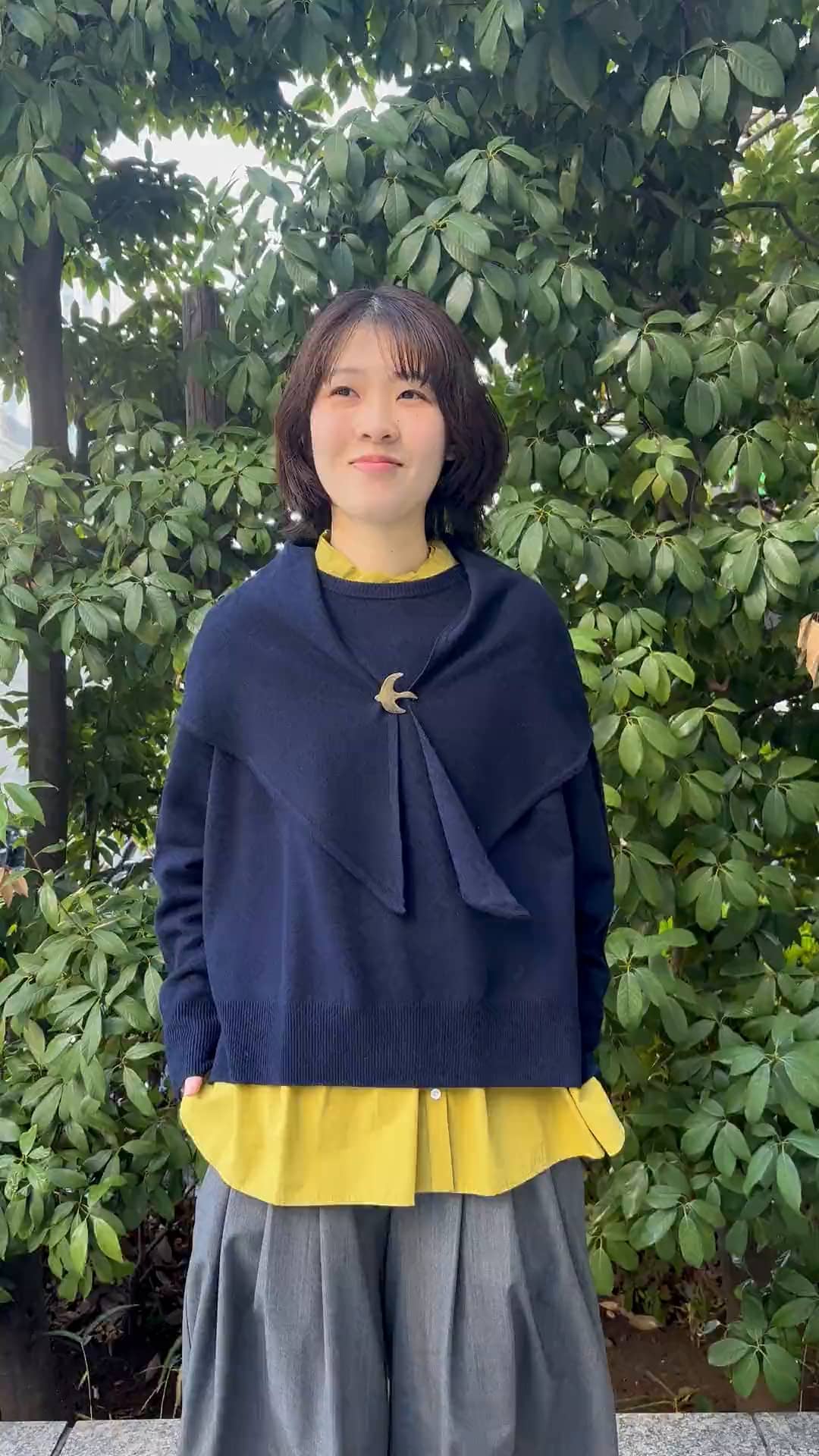 ネイビーニット×グレーパンツのコーデに、ピスタチオカラーのブラウスをイン。シンプルな中に色で遊び心を♡ネイビーのニットは、ストールがセットになっているので、色々な着方を楽しめます☺️