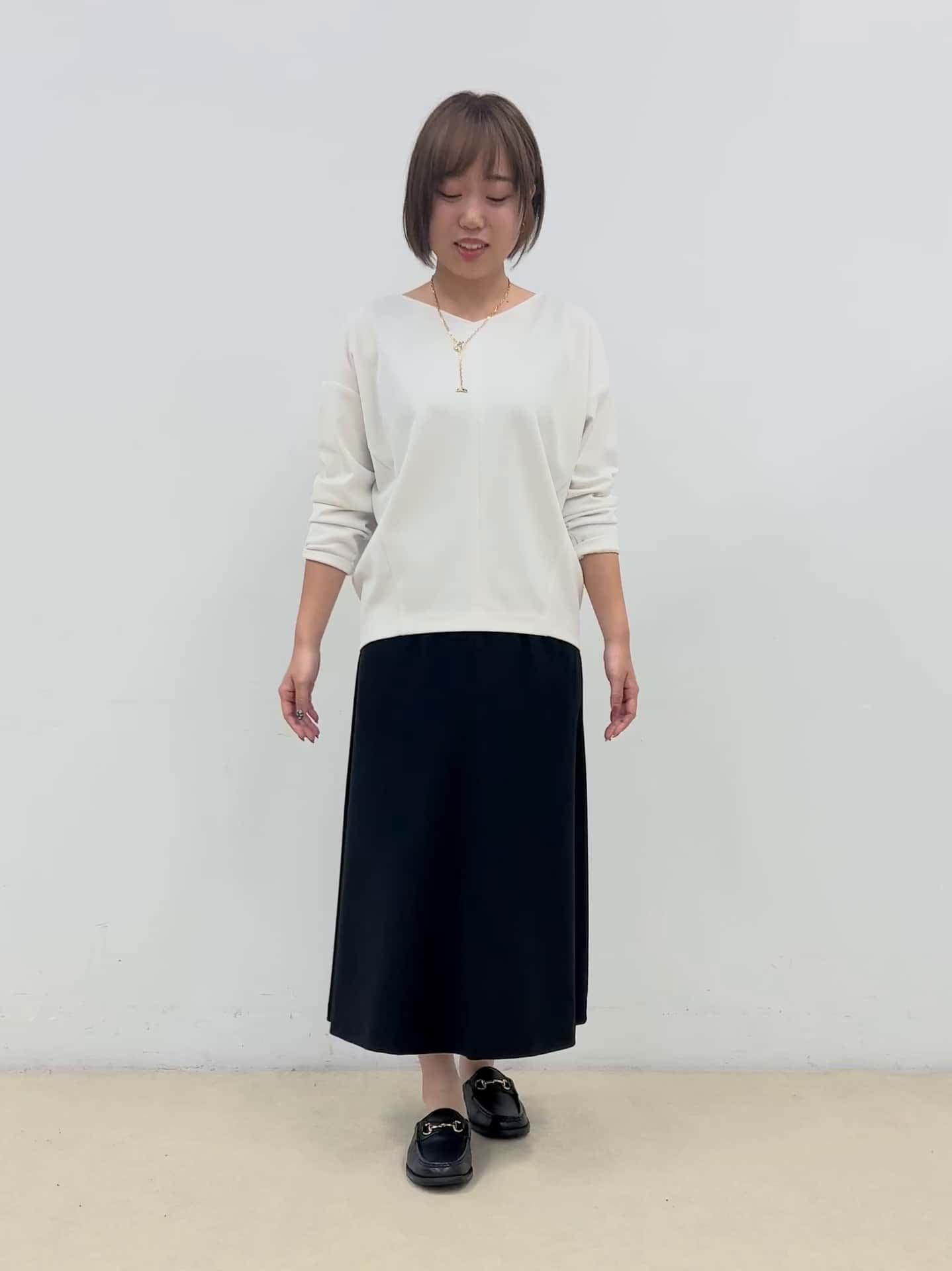 程良いドレープ感と光沢のあるジャージ素材の浅Vネックトップスに、フレアーラインのブラックスカートを合わせました。オフィスにも映える綺麗めスタイルで、きちんと感を保ちつつ女性らしい柔らかさも演出できます◎スカートは157cmで足首が見える丈感で、長すぎずちょうど良いバランスでした!