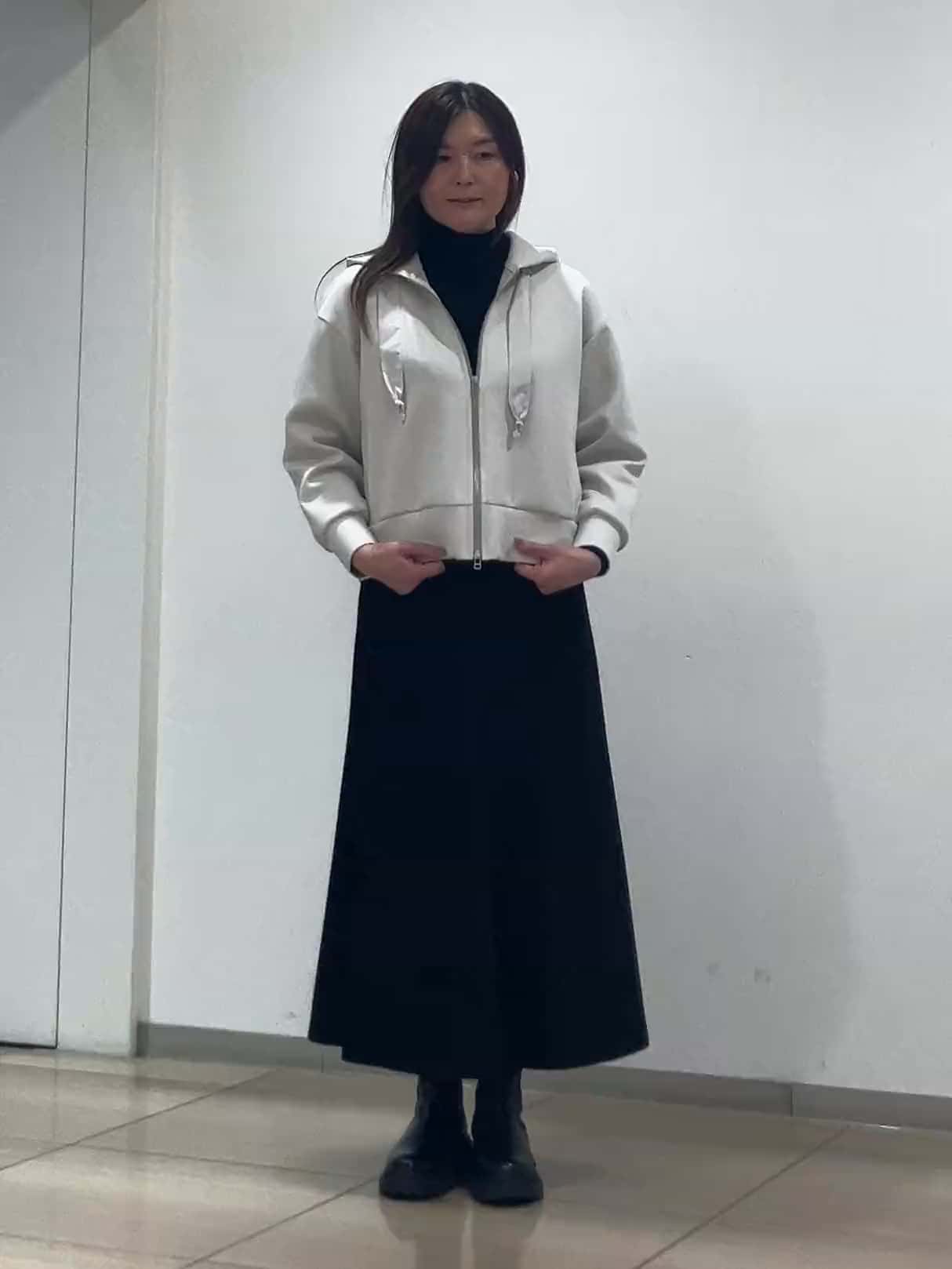 ライトグレーのジップパーカーは、もちっとしたダンボール素材で軽くて着やすく、短め丈なので高身長でもバランスよく着られます。ブラックスカートはウエストゴムで楽なのに、腰まわりはすっきり見え、程よいフレア感できれいめカジュアルにまとまるコーデです。