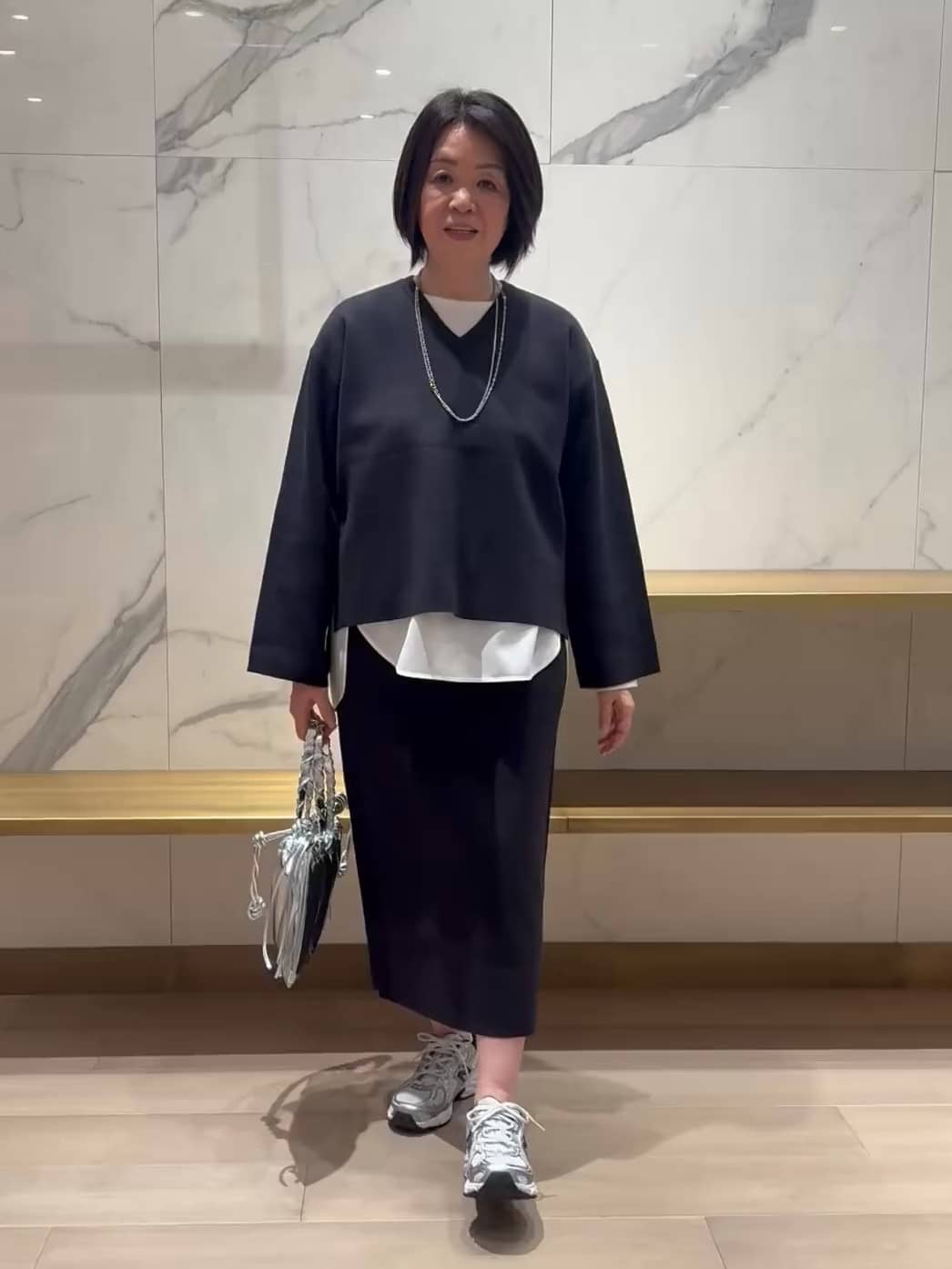 軽くてやわらかなニットを、ネイビーのセットアップで着てみました。チュニックはサイドスリット入りで動きやすく、体のラインを拾いにくいのが嬉しいポイント。スカートは程よい厚みがあり、ヒップまわりを自然にカバーしつつ後ろスリットで足さばきも楽です。インナーに白を重ねると奥行きのあるスタイリングに決まります◎