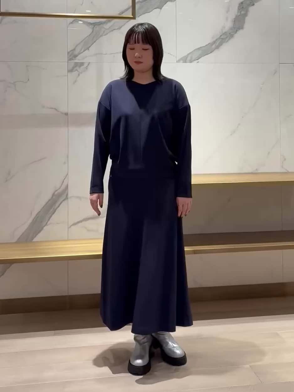 落ち感のきれいなトップスとスカートを、ダークネイビーでまとめてワンピース風に着てみました。トップスは浅めのVネックとゆるやかなシルエットで、体のラインをきれいに見せてくれます。スカートはウエストゴムで楽なのに、フレア感が上品なので、きちんとした場面にも使いやすいです。セットで着るとすっきりまとまり、セレモニーやお仕事にもおすすめです。