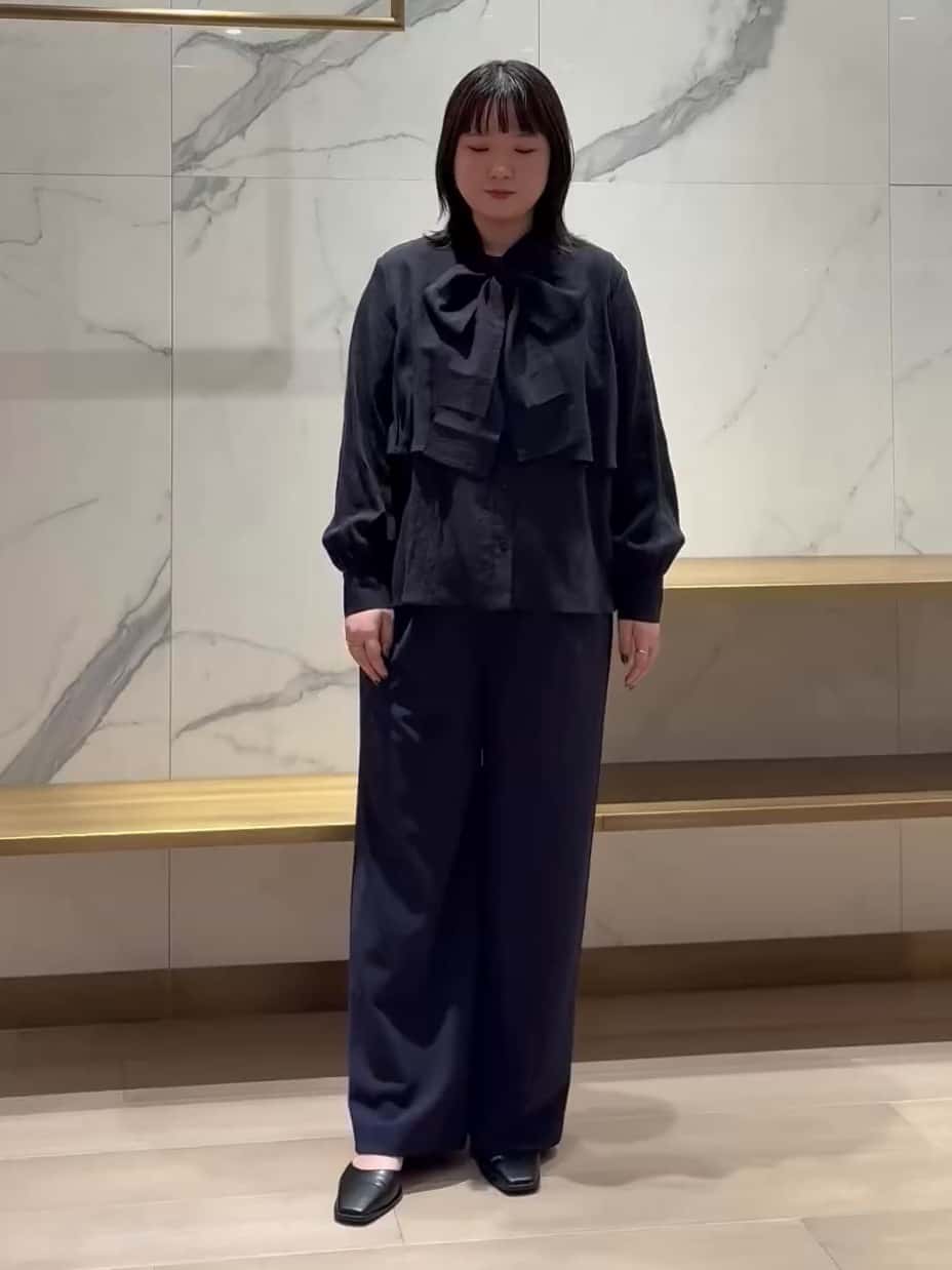 ネイビーのブラウスにダークネイビーのパンツを合わせて、落ち着いたきれいめスタイルにしました。ブラウスはほんのりツヤがあり、シボ感のおかげで一枚でもきちんと見えます。タイは外してシンプルに着ても、付けて華やかにしても印象を変えられるのが便利です。パンツはウエストゴムで楽なのに、ラインがきれいなのでオフィスやきちんとした場にも使いやすい組み合わせです。