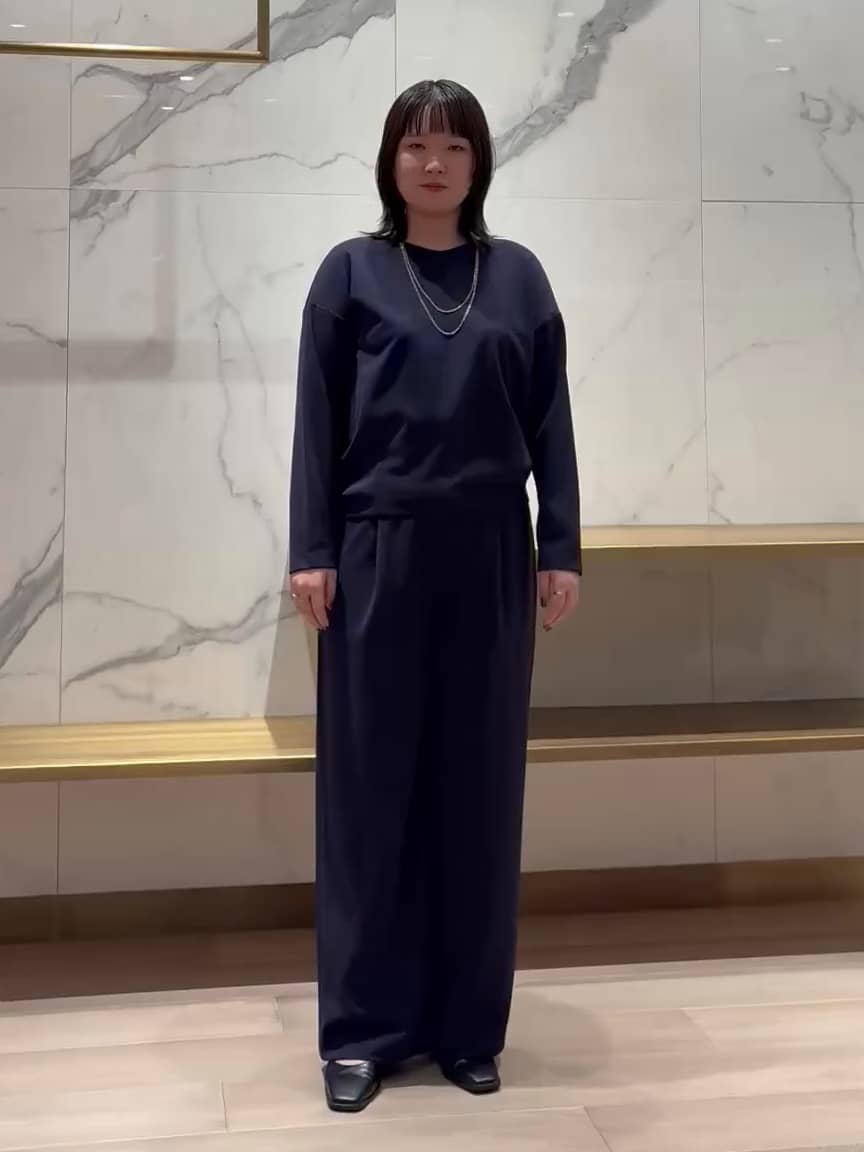 浅めのVネックと落ち感のあるシルエットで、すっきり着られるトップスに、ウエストゴムで楽なセミワイドパンツを合わせたダークネイビーのワントーンコーデです。全体がきれいにまとまり、リラックス感がありながらも上品に見えるので、通勤やきちんとしたシーンにも使いやすいスタイリングです。
