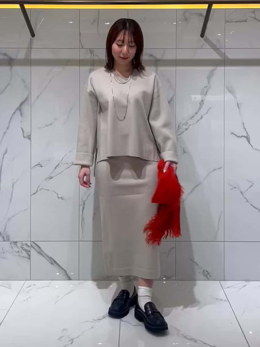 ライトベージュのニットセットアップでまとめた、やわらかく上品なスタイリングです。軽くて肌あたりの良いニットなので、チュニックとスカートの組み合わせでも重たく見えず、自然に体のラインをカバーしてくれます。そこに赤のストールを足すことで、シンプルなコーデの程よいアクセントに◎