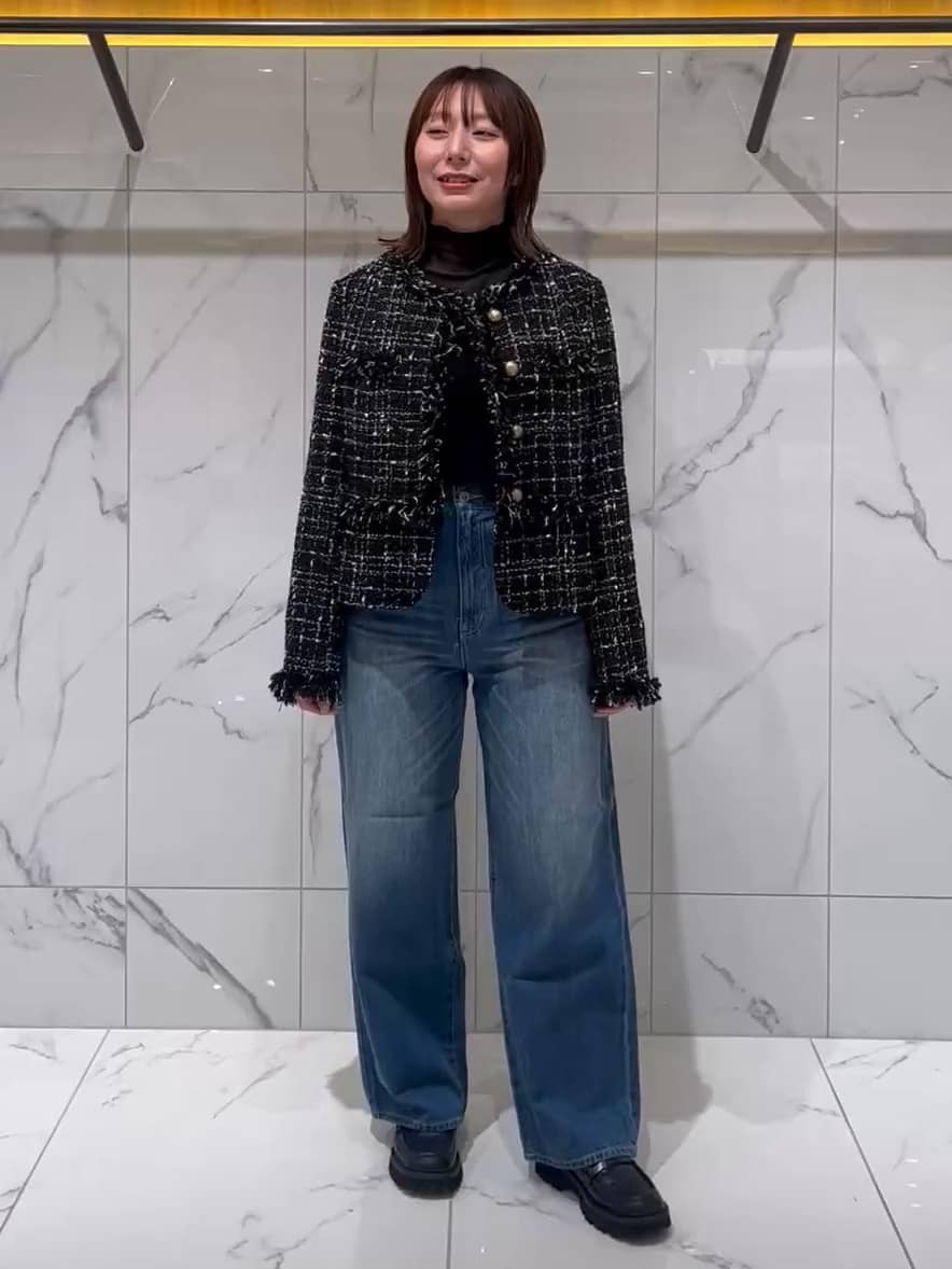 ブラックのツイードジャケットを主役に、ワイドデニムでほどよく力を抜いたスタイリングです。モノトーンの立体感ある素材に、インナーもブラックでまとめることで、クラシカルな雰囲気を崩さず洗練された印象に仕上げています。コンパクトなショート丈なので、ボリュームのあるデニムとも好バランス。ローファー合わせで、きちんと感とカジュアルさを両立した着こなしです。