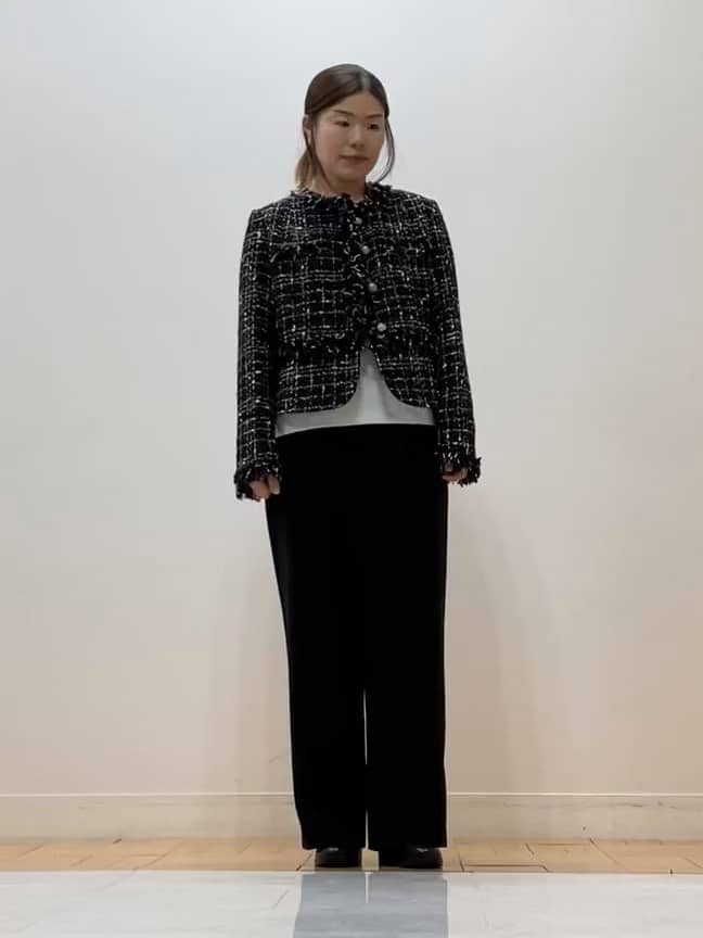 立体感のあるツイードジャケットは、素材自体に表情があるため、ワントーンでも重たく見えません。コンパクトな丈感が全体のバランスを引き締め、きちんと感を高めています。