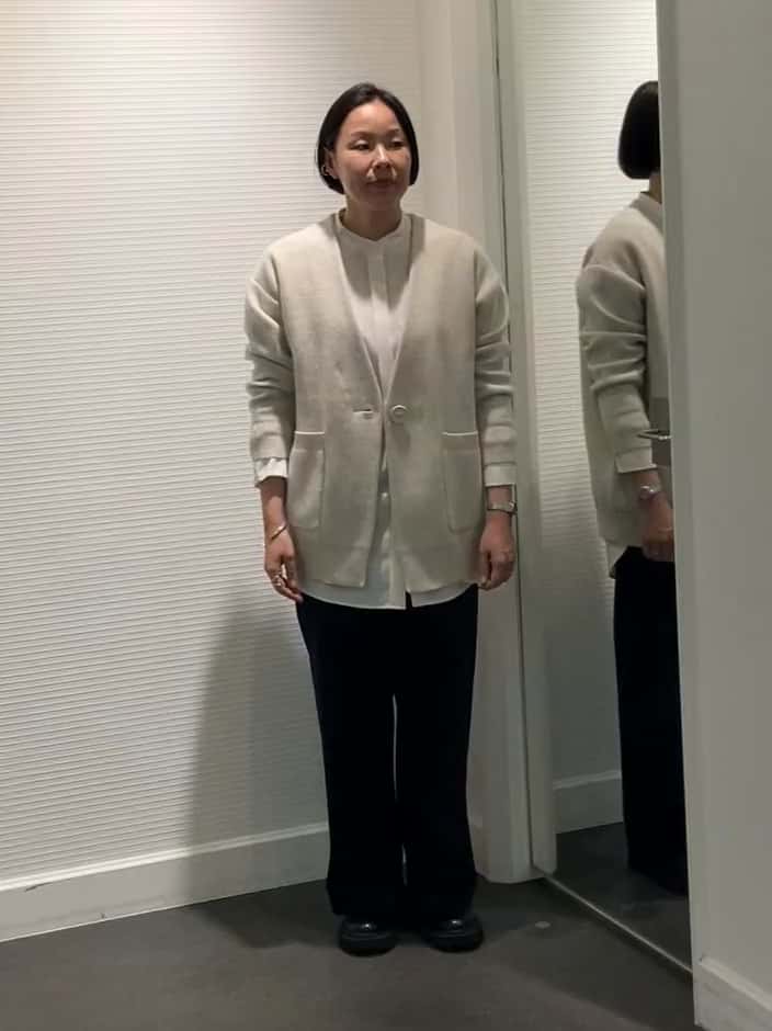 ふんわり起毛のカーディガンは軽くて羽織りやすく、さっと着るだけで雰囲気が出ます。中は落ち感のあるブラウスを合わせて、やわらかさときちんと感をプラス。
