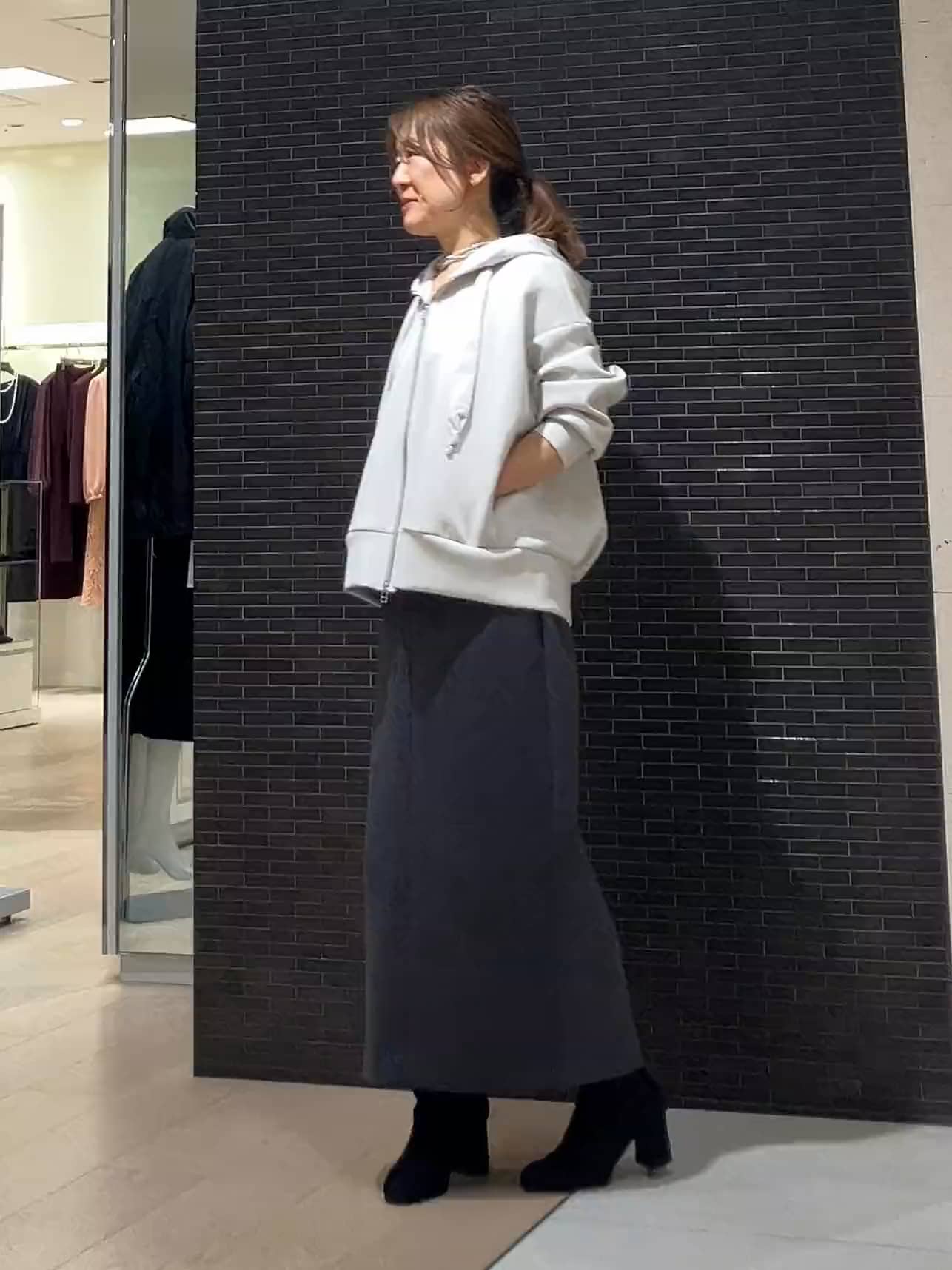 ライトグレーのパーカーは、もちっとした弾力のある素材で着心地が良く、短め丈なのでバランスよく決まります。きれいな表面感で、カジュアルすぎないのもポイントです。