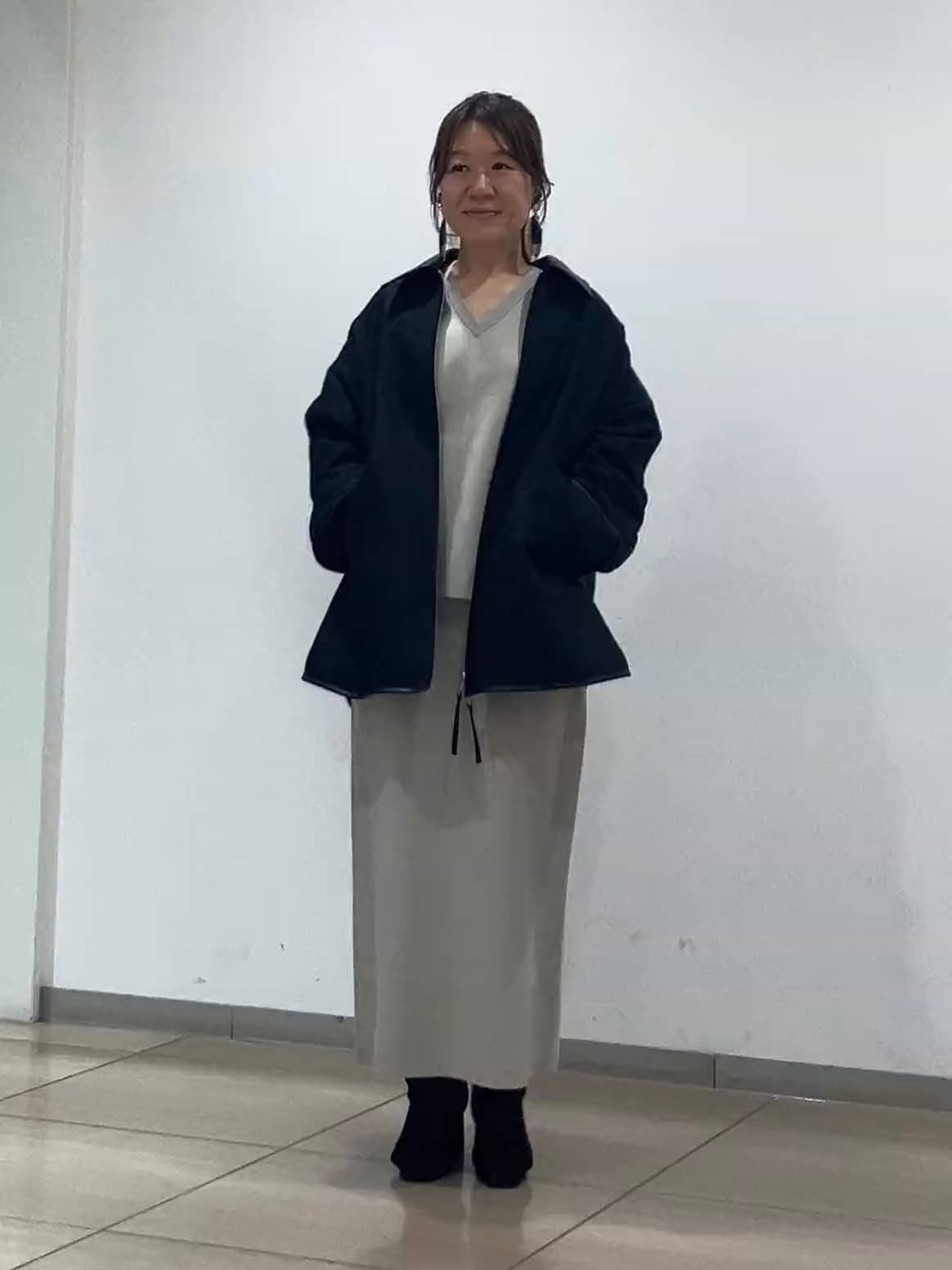 ライトベージュのニットセットアップに、あブラックの中綿コートを重ねることで、全体が引き締まり大人っぽい印象になります。ポンチョのようなゆったりシルエットなので、セットアップの上からでももたつかず、さっと羽織るだけで様になります。軽くて動きやすく、フェイクレザーの襟がほどよいアクセントになり、カジュアル過ぎずきれいめに仕上がるのもポイントです。