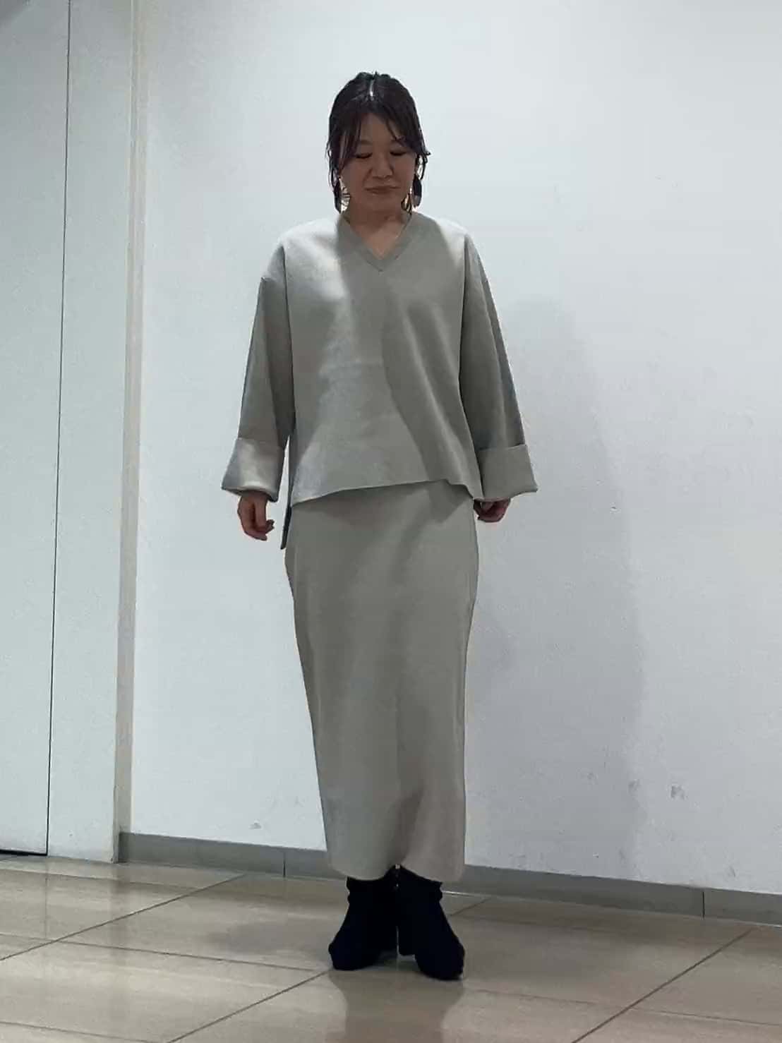 やさしい肌触りで、見た目より軽く着られるニットなので、小柄な方でも重たく見えにくいのがポイントです。チュニックはサイドスリット入りで動きが出やすく、体のラインを拾いにくいのも安心。スカートは程よい厚みでヒップ周りをカバーしつつ、後ろスリットで歩きやすさも◎。ライトベージュのワントーンで、やわらかく上品にまとまります。