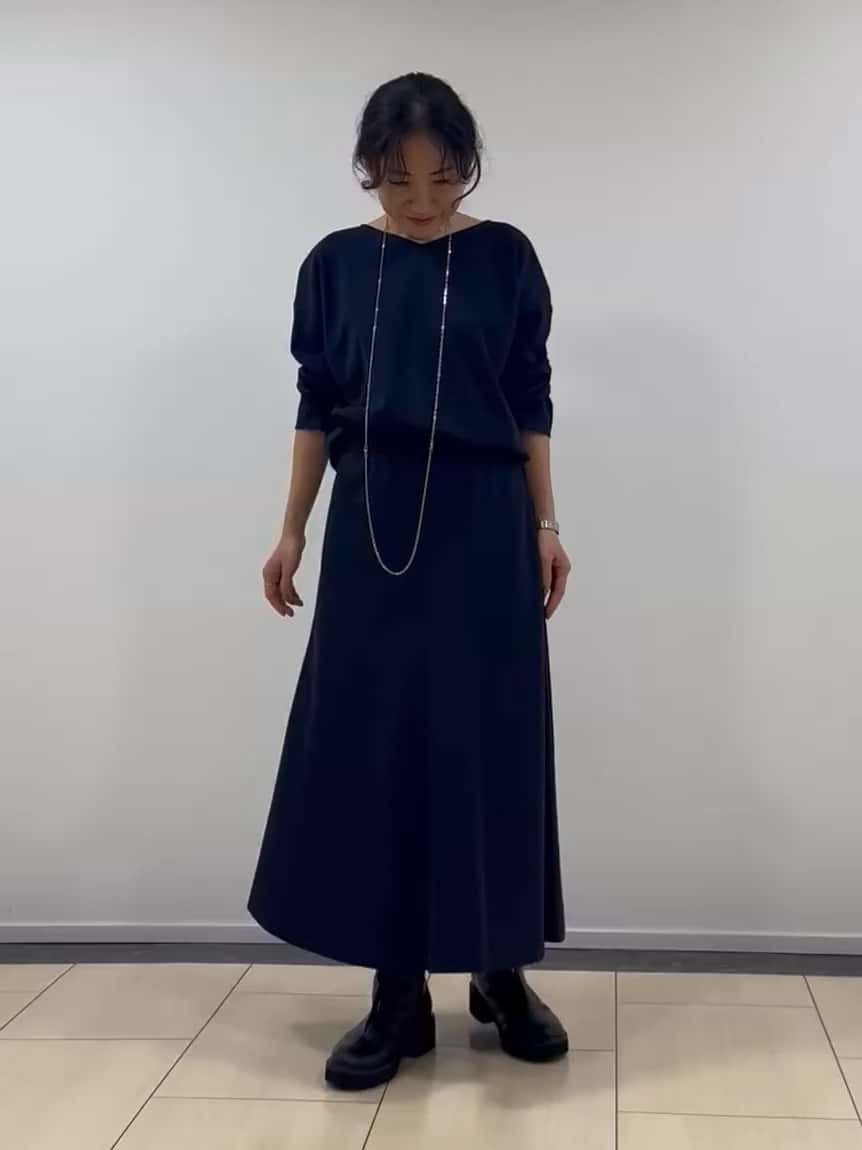 落ち感のあるトップスは体に沿いすぎず、浅めのVネックと肩の落ち感で上半身がすっきり見えます。スカートはウエストゴムでも腰まわりが広がらず、着丈も長すぎないので小柄さんでもバランスよく着用できました。上下ダークネイビーでまとめることで、縦ラインが強調され、自然とスタイルアップして見える組み合わせです。スカートは身長152cmで1サイズを着用し、足首が出る丈でした。