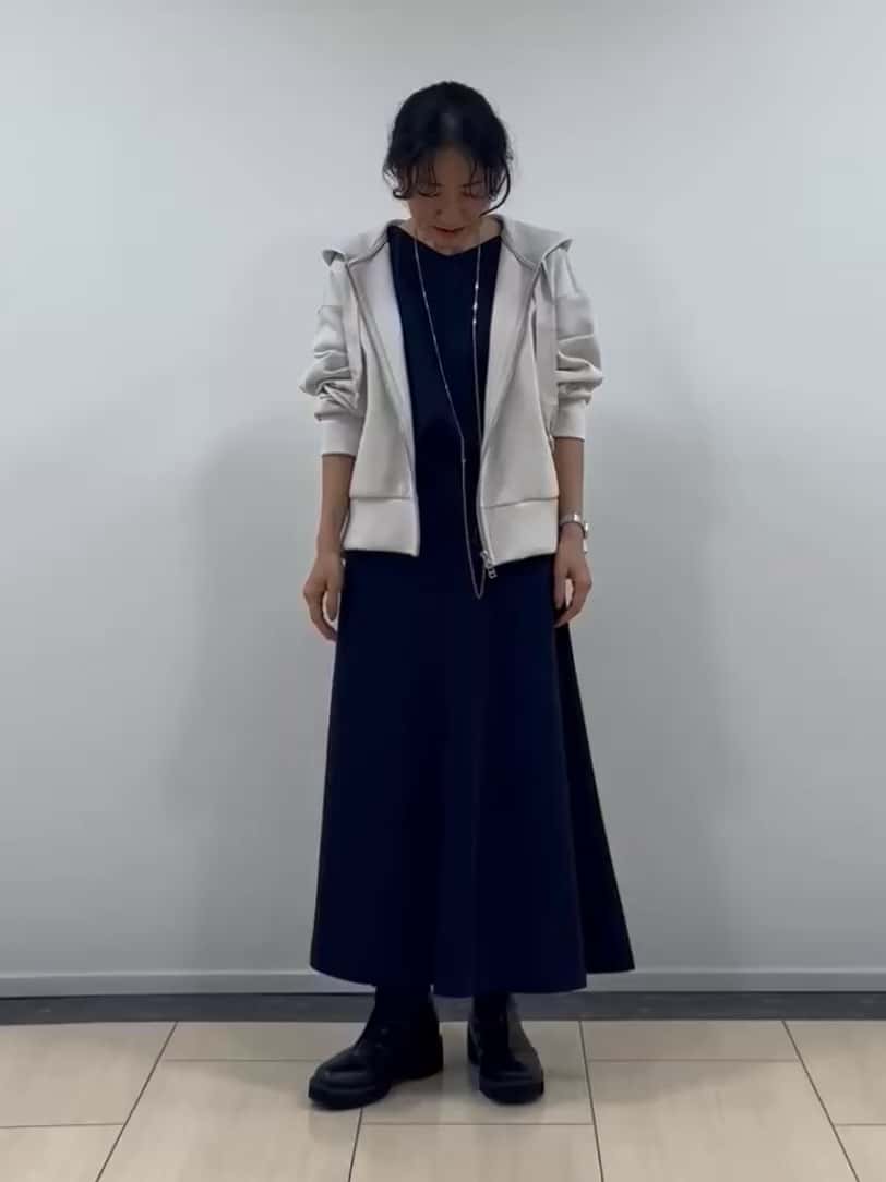 パーカーは身幅にゆとりがありますが、着丈が短めなので大きく見えず、自然と腰位置が高く見えます。中のトップスは体のラインを拾いにくい程よいゆとりで、インしてももたつきません。スカートはウエストゴムで楽ですが、腰まわりはすっきりしているので広がりすぎず、小柄の方も安心して着られるサイズ感です。