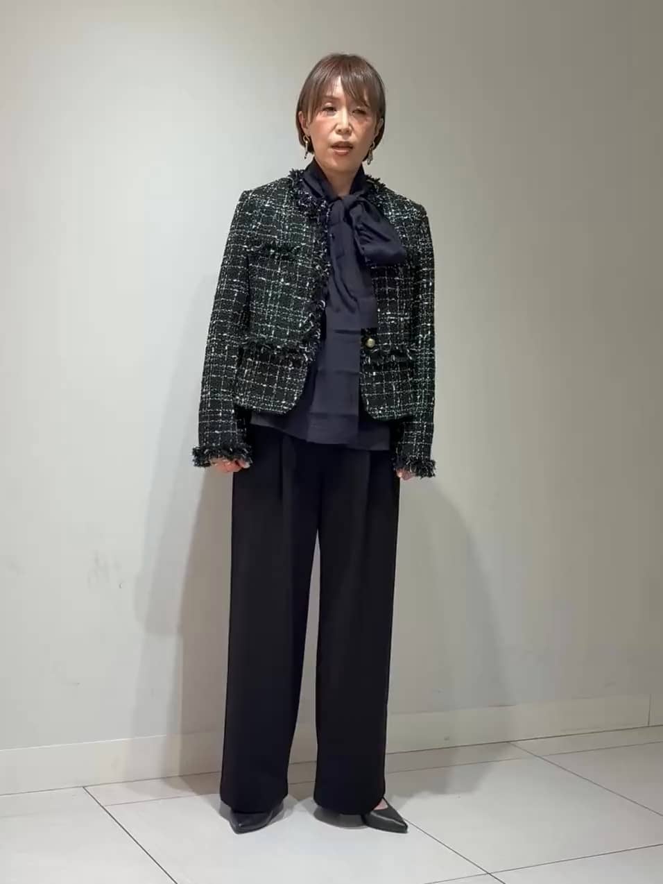 インナーのブラウスは落ち感があるので、ジャケットを羽織ってももたつかず上品な印象に。ボウタイを結ぶことで顔まわりが華やぎ、式典やきちんとした場にも安心して着られます。パンツはセミワイドですが広がりすぎず、ジャケットの短め丈とバランスよく、きれいに着こなせるセレモニーコーデです。