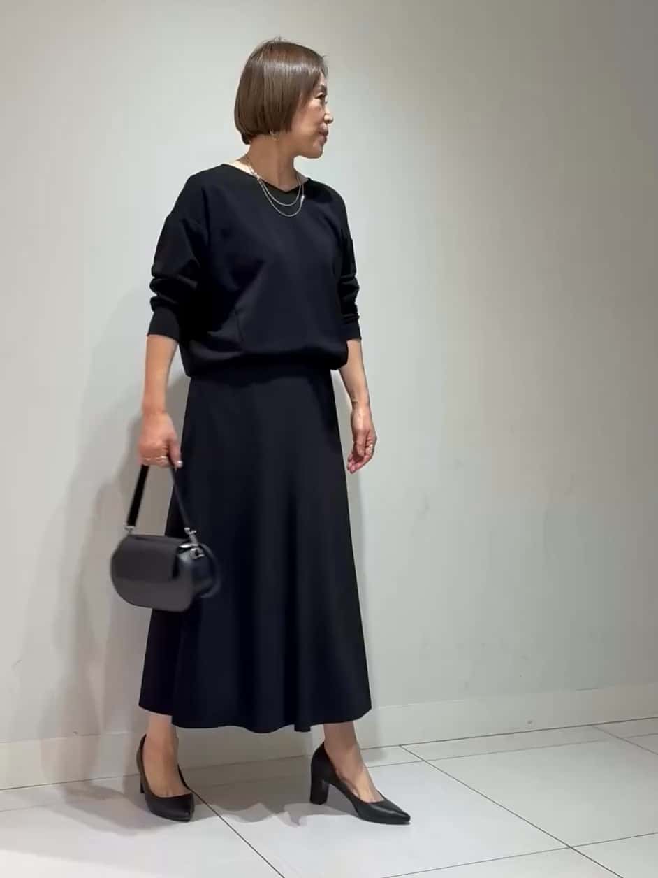 程よく落ち感のあるトップスと、上品に広がるスカートを上下ブラックでまとめたきれいめスタイルです。