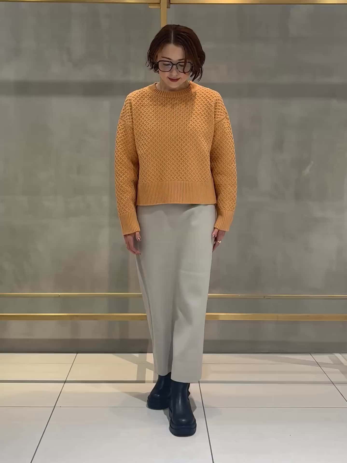 オレンジのニットが主役になる、明るくて春らしい組み合わせです。ショート丈なので腰位置が高く見え、ライトベージュのスカートと合わせると全体がすっきりまとまります。ニットは見た目に反して軽く、ほどよい厚みがあるので体のラインを拾いにくい印象。スカートはヒップまわりを自然にカバーしてくれて、後ろスリットのおかげで歩きやすさもあります。きれいめですが、気負わず普段使いしやすいセットです。