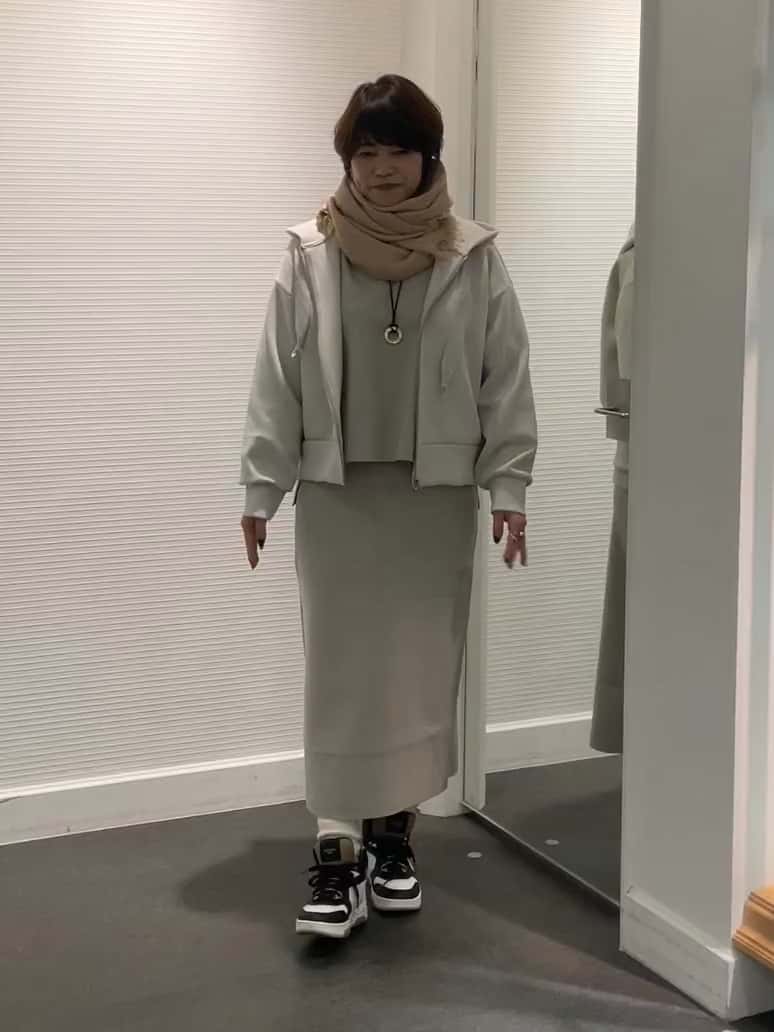 ライトグレーのパーカーにライトベージュのニットセットアップを合わせ、ベージュのストールをプラスしたコーディネートです。パーカーはハリのあるダンボール素材でカジュアルに見えつつ、セットアップのニットで女性らしさを演出。後ろスリット入りのスカートで動きやすく、スニーカーでまとめてラフに仕上げた軽やかなデイリースタイルです。
