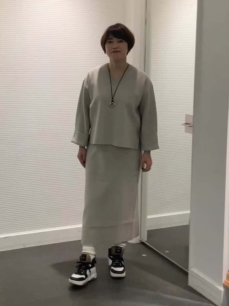 ライトベージュのニットセットアップは軽やかで柔らかい印象。サイドスリット入りのチュニックと後ろスリット入りスカートで動きやすく、ストールを肩に掛けて温かみをプラス。スニーカーでラフにまとめて、カジュアル感と快適さを両立させたデイリースタイルです。