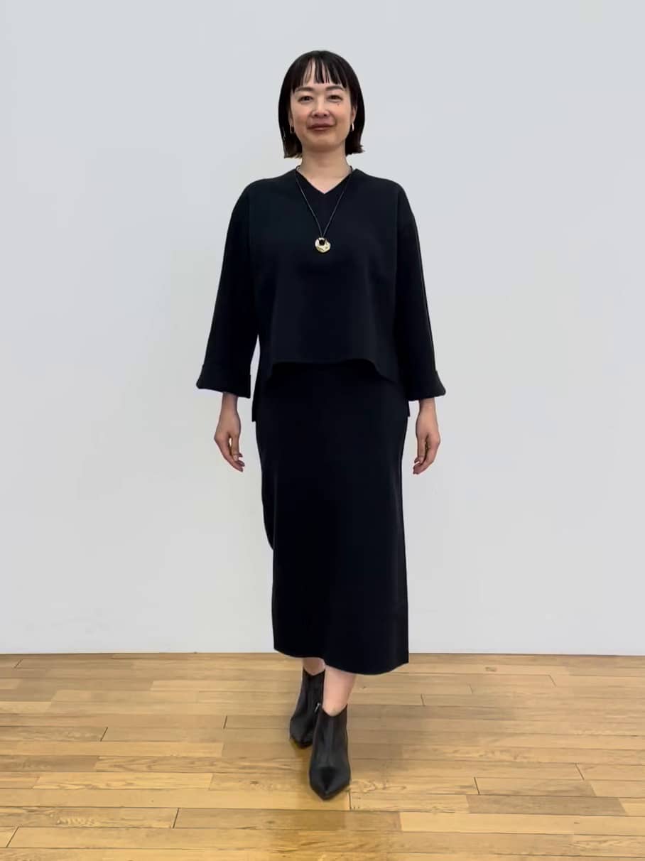 ネイビーのニットとスカートのセットアップコーディネートです。トップスはサイドスリット入りで片畦編地がアクセントになり、動きやすく軽やかな印象。スカートも片畦編地でヒップ周りをカバーしつつ、後ろスリットで足さばきも快適です。ヒールのショートブーツを合わせることで、カジュアルになりすぎず品のある着こなしに仕上げています。