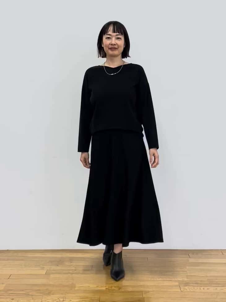 ジャージ素材のトップスは程よいドレープ感と柔らかい光沢があり、浅めのVネックとドロップショルダーで肩周りを自然に美しく見せます。身幅はゆったりめで、裾に向かって軽くフィットするシルエットが特徴です。スカートはウエストから腰まではすっきり、裾に向かって自然なフレアラインを描き、ギャザーゴム仕様で動きやすく快適です。上下ともブラックで統一し、ショートブーツを合わせることで、落ち着いた印象ながら女性らしさを感じる綺麗めコーディネートに仕上がります。
