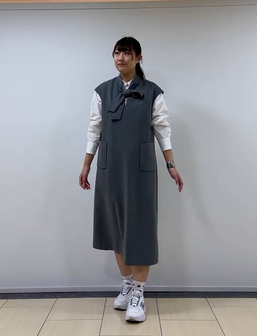 着用感:シャツやチュールなどを重ねて着用できるワンピース。168cmが着るとふくらはぎ丈になります。主な素材がポリエステルなので、暖かくなったら薄手のカットソーやブラウスとも合わせられ、シーズン長くお使いできます。
