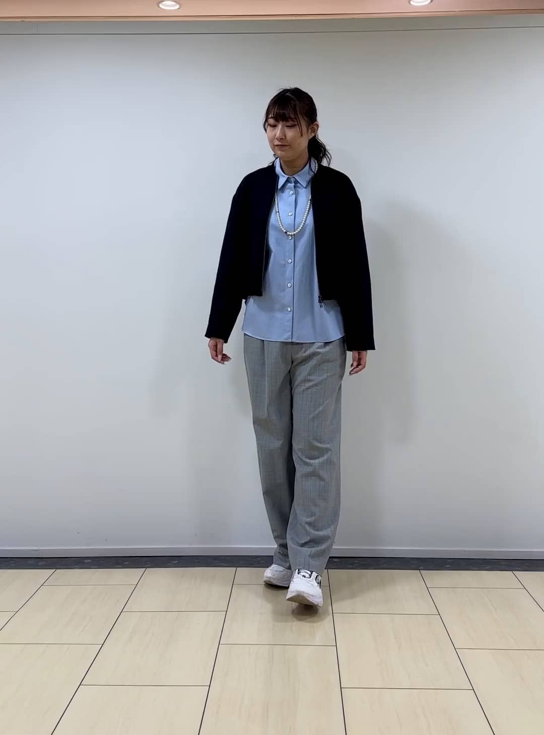 着用感:梅春仕様の少し薄手のウール混パンツ。ワイドシルエットがすっきりとした、お家で洗濯できる万能パンツです。