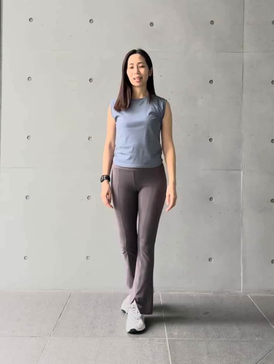 トップス:0(S~M)サイズレギンス:0(S~M)サイズ上はすっきりしたノースリーブ、下は程よく広がるフレアシルエットです。コンパクト×ボリュームのバランスで、脚長&洗練された印象に仕上げました。