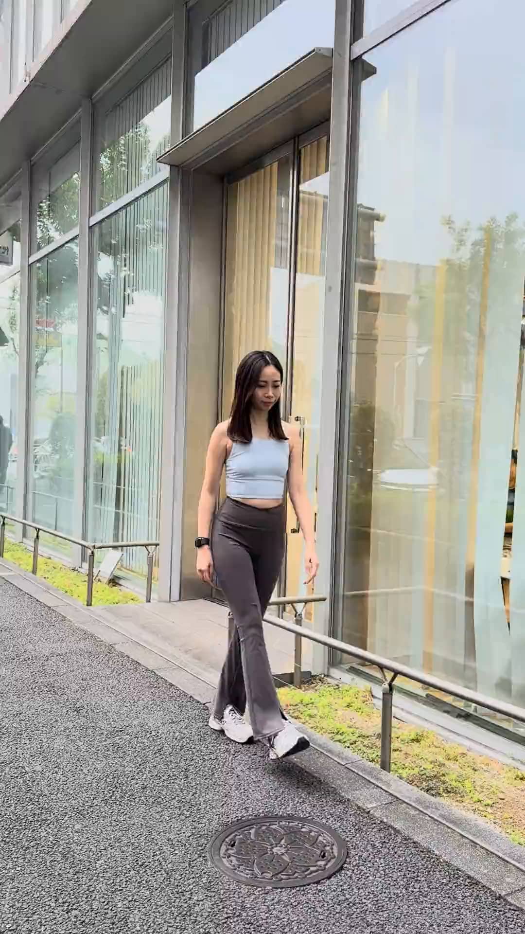 ハイウエストのフレアレギンスが、脚のラインをまっすぐ長く見せてくれるコーディネート。