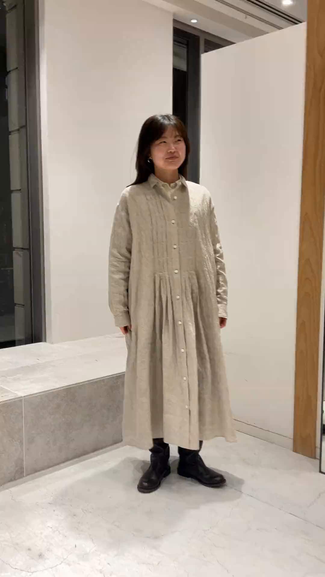 お馴染みのグランジリネンを重ね着。まだ寒いこの時期に春を意識したコーディネート。定番的だけれど少し違った見せ方で、そしてやっぱり着やすいワンピース。