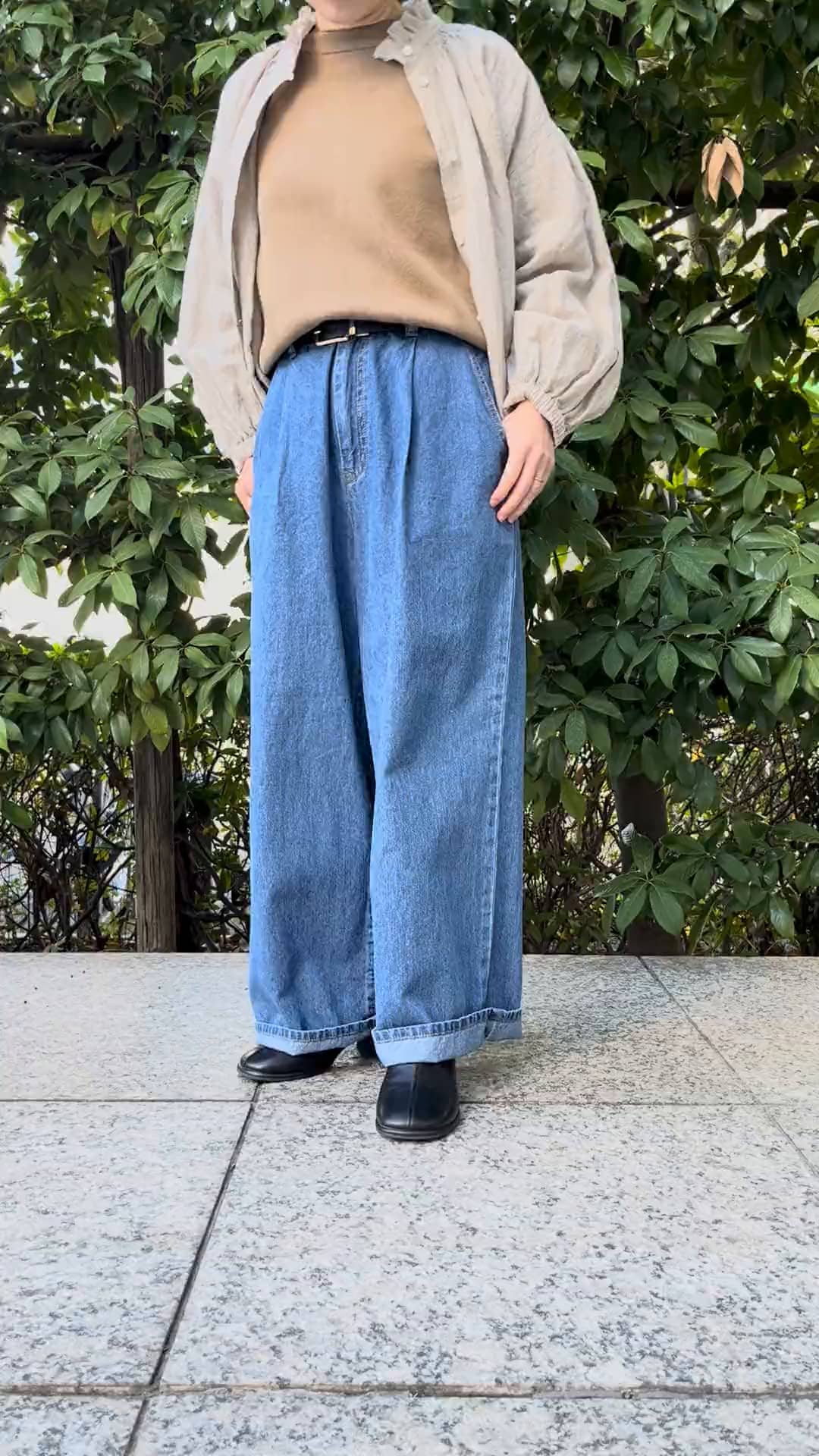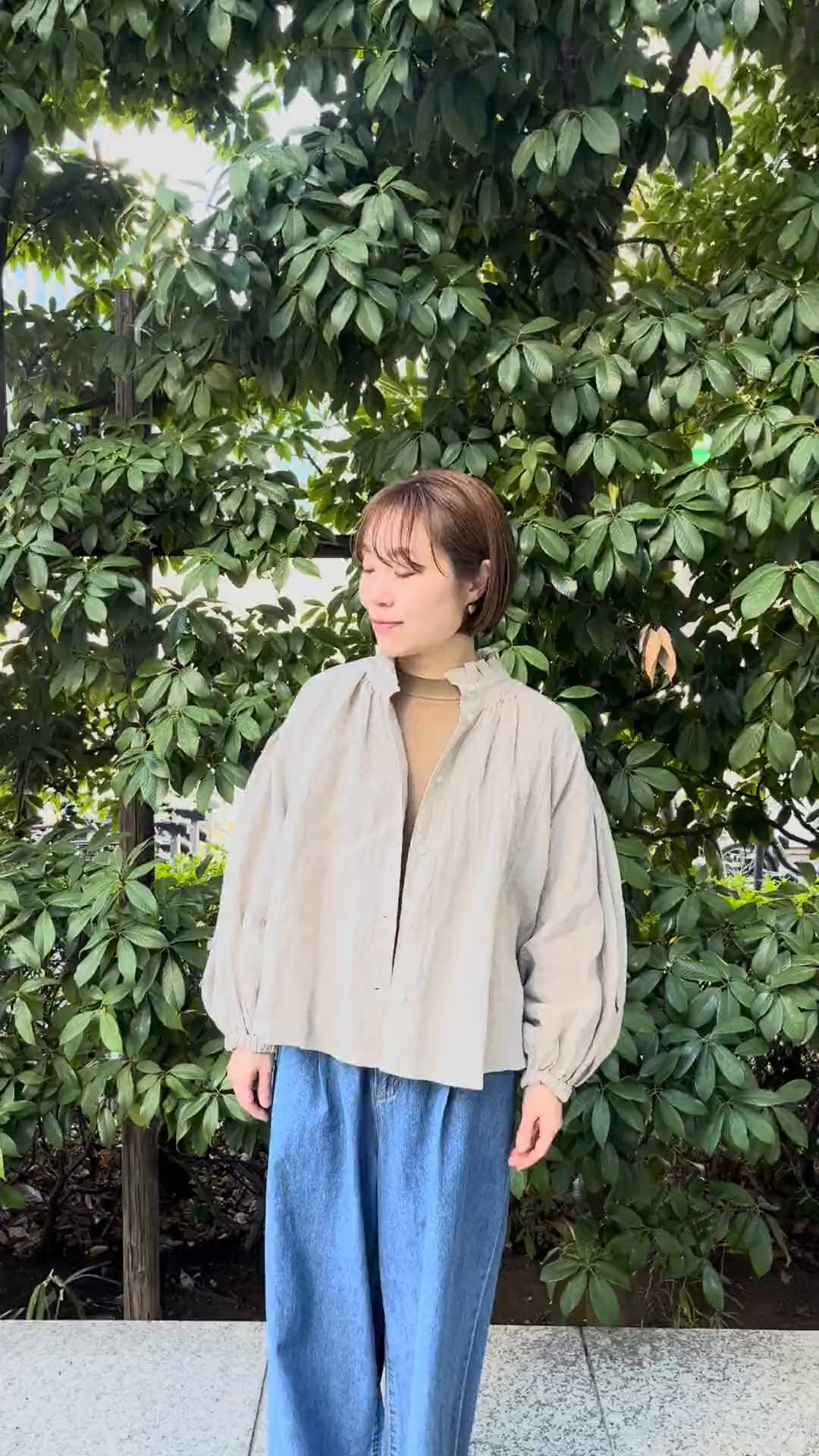 まだ肌寒い季節なのでグランジリネンのブラウスに綿ニットをレイヤード。ボリュームスリーブが甘さもあり、存在感のあるシルエットです。ストレートデニムは152センチの身長でMをロールアップ。今季おすすめのデニムです!