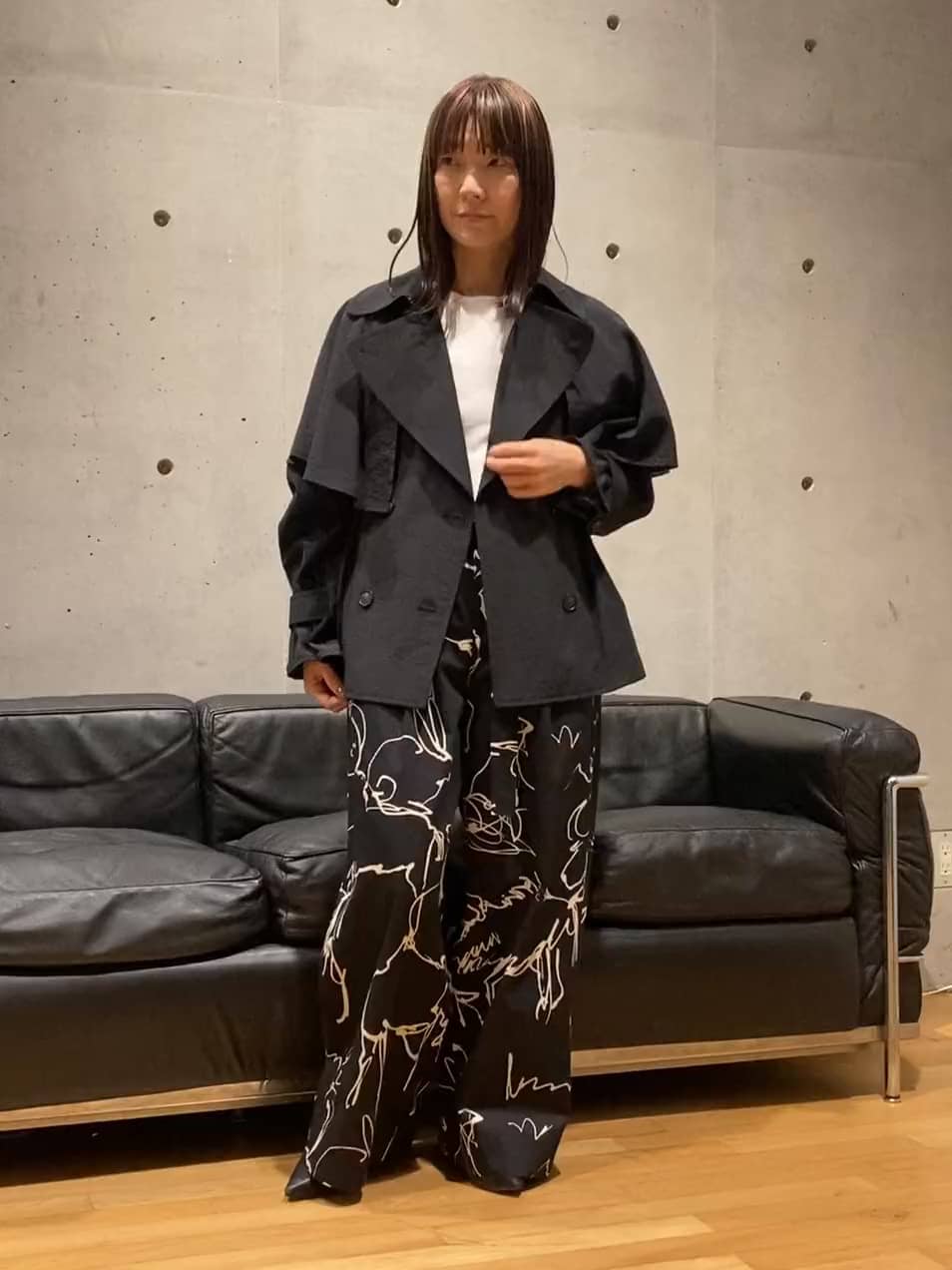161cmでジャストなフルレングス。ネイビーのコートを合わせることで、アートな動物柄がより引き立ち、大人っぽくまとまります。