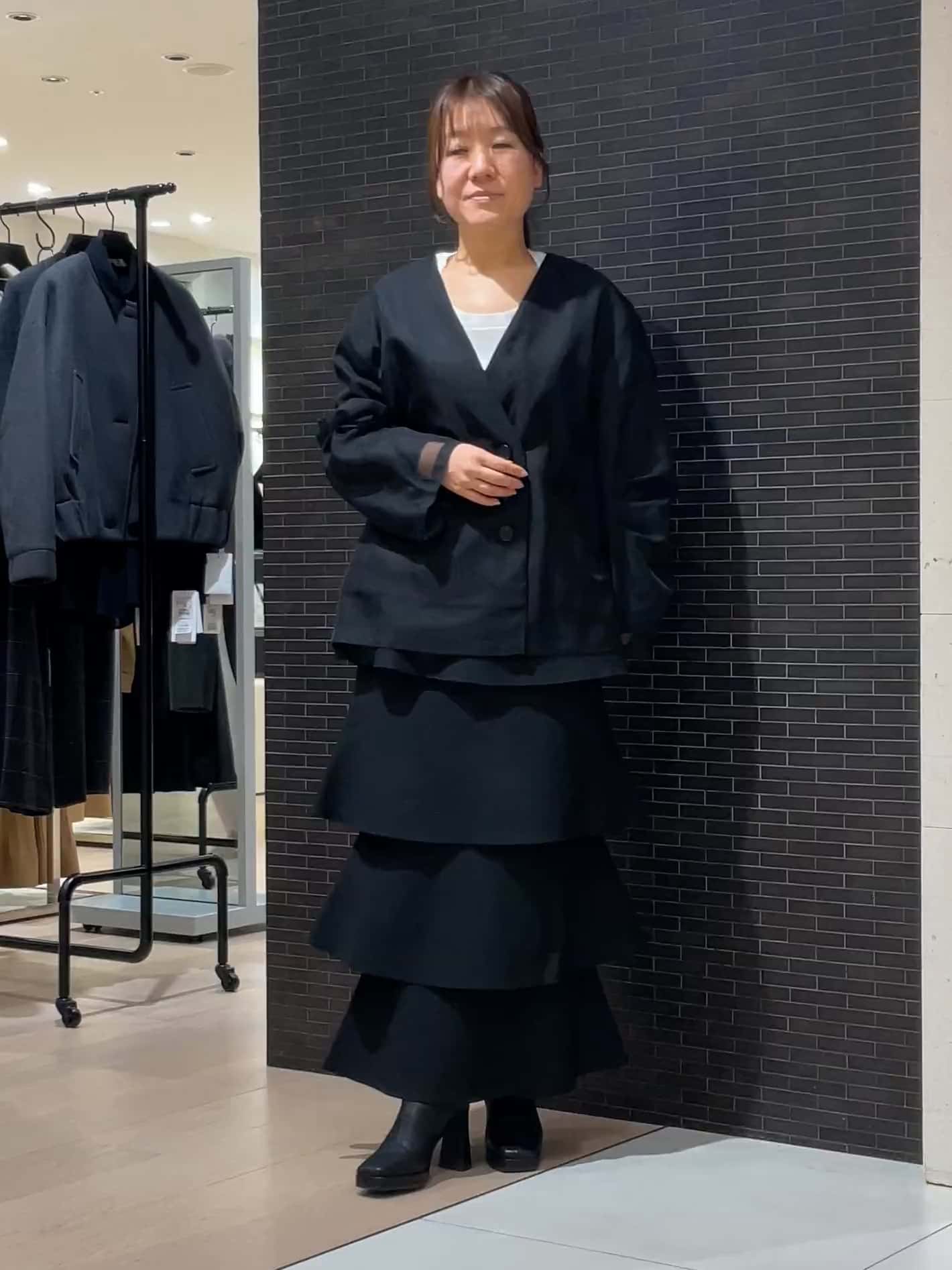 153cmでヒップが少し隠れるくらいの丈感です。ストライプの生地に透ける素材を重ねることで、黒でも重たくならず、どこか繊細で優雅な雰囲気になります。驚くほど軽く、肩が凝らないのも嬉しいポイントです。少し抜きぎみで着用しています。
