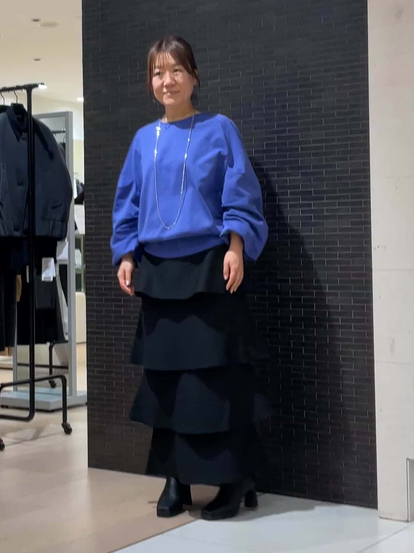 丈感を調節するためにウエストを一つ折って着用しています。重なったフリルのデザインが動くたびに美しく揺れ、広がりすぎないスッキリとした形が大人っぽさを引き立ててくれます。とても軽いニット素材なので、ボリュームのあるトップスと合わせても足取りは軽やかです。