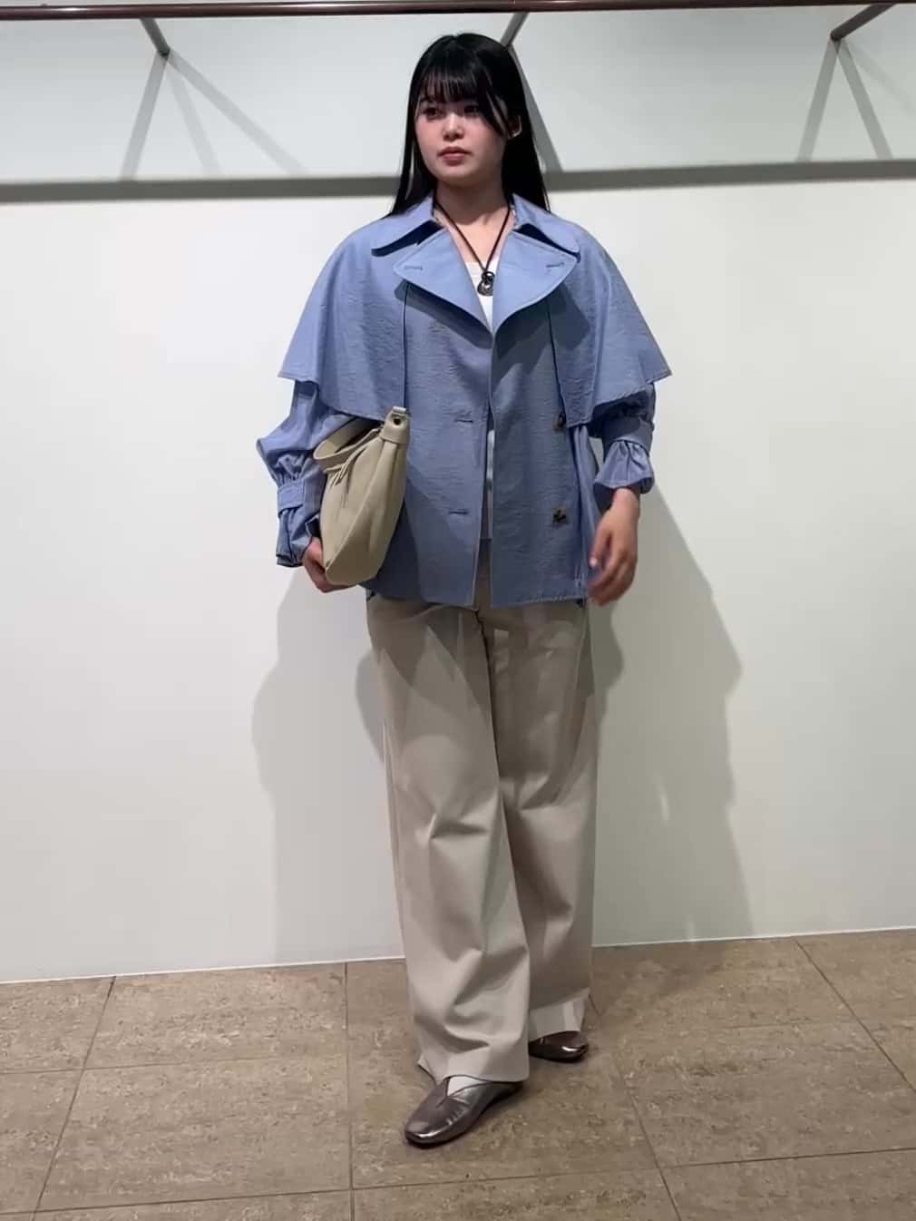 ドレープが華やかなショートトレンチ。ウエストのドロストでシルエットの変化が楽しめます。ボトムは程よい太さのワイドパンツ。ストレッチが効いていてとても履きやすいです。