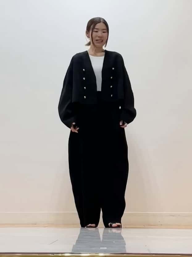 159cmで、ウエスト周りがスッキリ見えるコンパクトなショート丈です。 構築的な袖のフォルムが際立ち、度詰めの編地ながら驚くほど軽く、肩の凝らない着心地です。