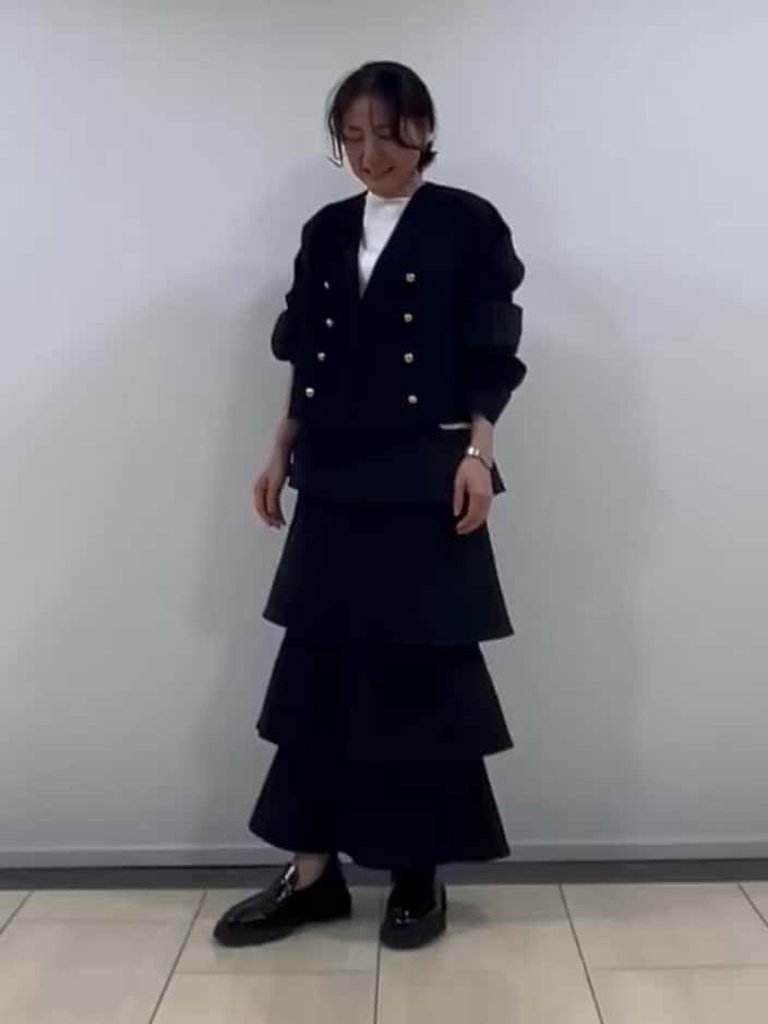 ショート丈ジャケットとラッフルスカートを合わせることで、重心が上がり、全体のバランスがとても綺麗に見える組み合わせです。
