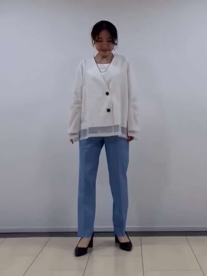 ジャケットの透け感とパンツのワッシャー感が絶妙にマッチし、カッチリしすぎない、デイリーな装いです。