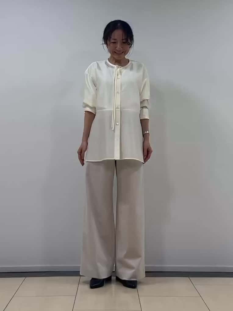 152cmで1サイズを着用し、ヒールを合わせて美脚に見えるフルレングス丈です。ウエストが総ゴムなので、ブラウスをアウトして着てもお腹周りが苦しくなく、リラックスして過ごせます。