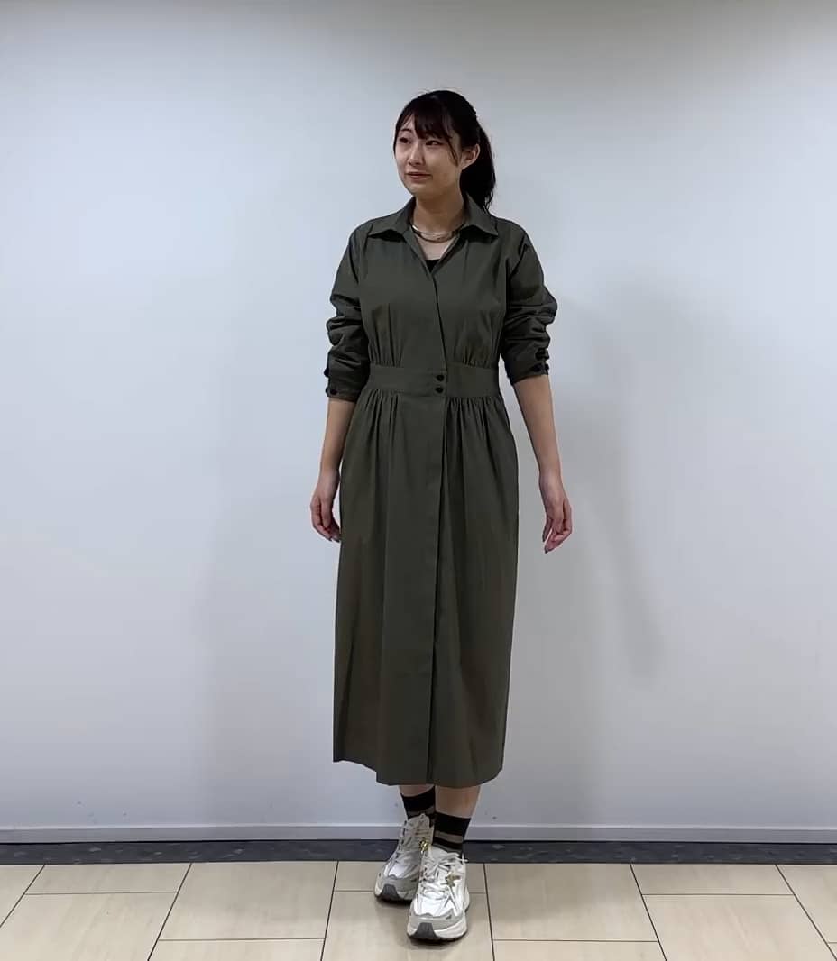 着用感:程よいゆとりのある着用感にも関わらず、シャープな印象を与えてくれるワンピース。高身長の方でも一枚でワンピースとしてでも着用できる長めの着丈です。前開きなので、パンツと合わせたレイヤードスタイルでもお使いいただけます◎