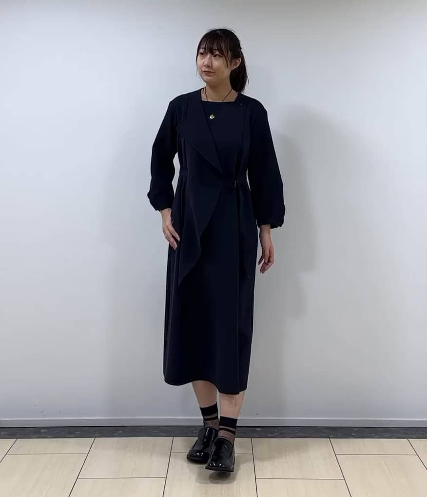 着用感:取り外し可能なベルトをつけることでフェミニンな印象になり、胸元のドレープがアクセントになるワンピース。デザインが個性的で落ち感がきれいなので、お食事やお集まりの際にも活用できます◎高身長の方が一枚で来ていただいても着丈感は気にならずにお使いできます◎
